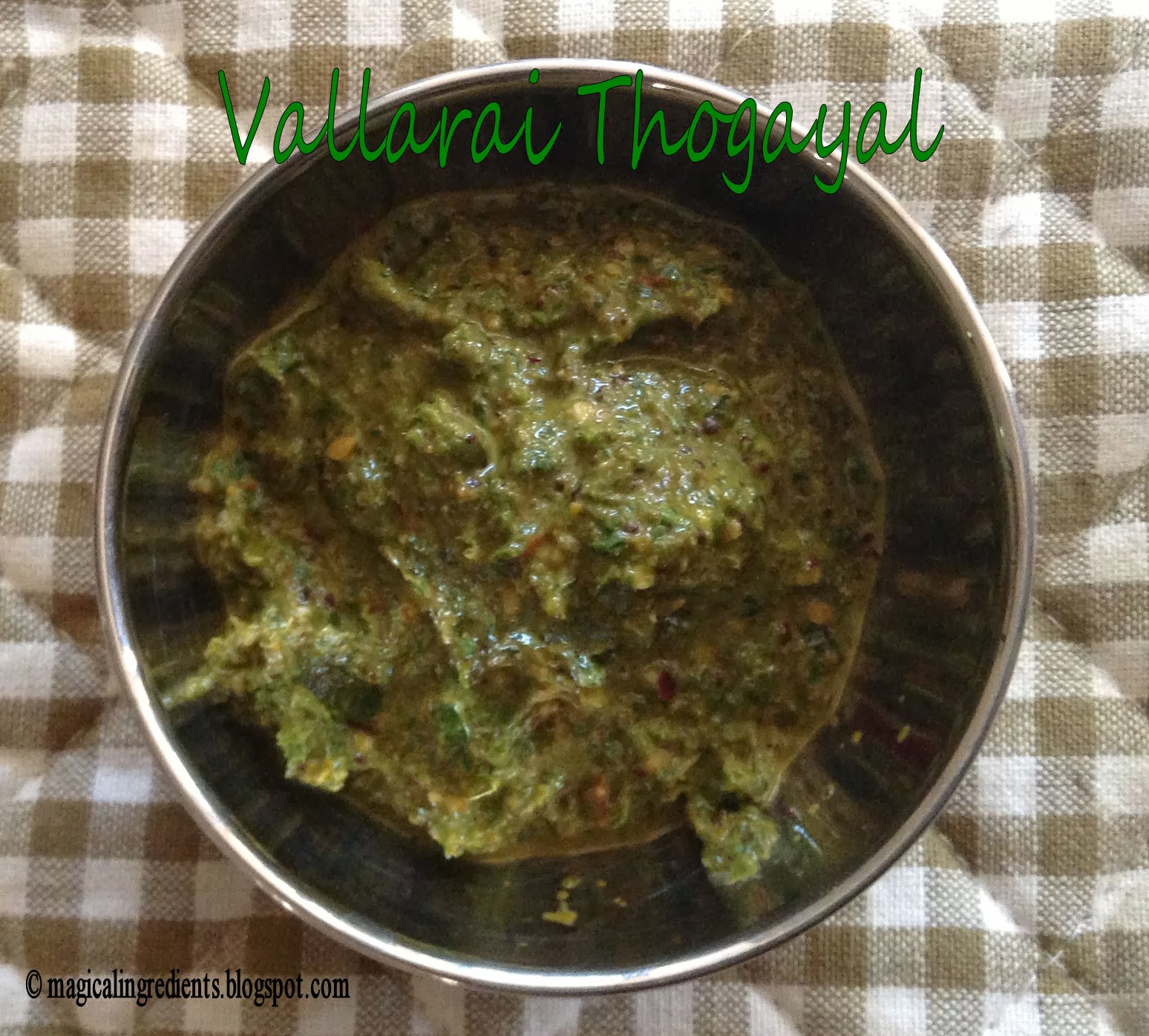 Heat oil in a pan. Add red chillies, mustard and urad dhal. When the mustard splutters, add hing and the leaves. Saute for a min, till the leaves get wilted. Cool this mixture and grind with salt, tamarind, and jaggery. Adjust salt if needed. That's it, delicious thogayal is ready to eat mixed with rice and a dollop of sesame oil which brings out lots of flavor. Any thogayal rice is best accompanied by fried papad or vadam. Wow! a tasty and fast meal is ready by the time rice gets cooked.