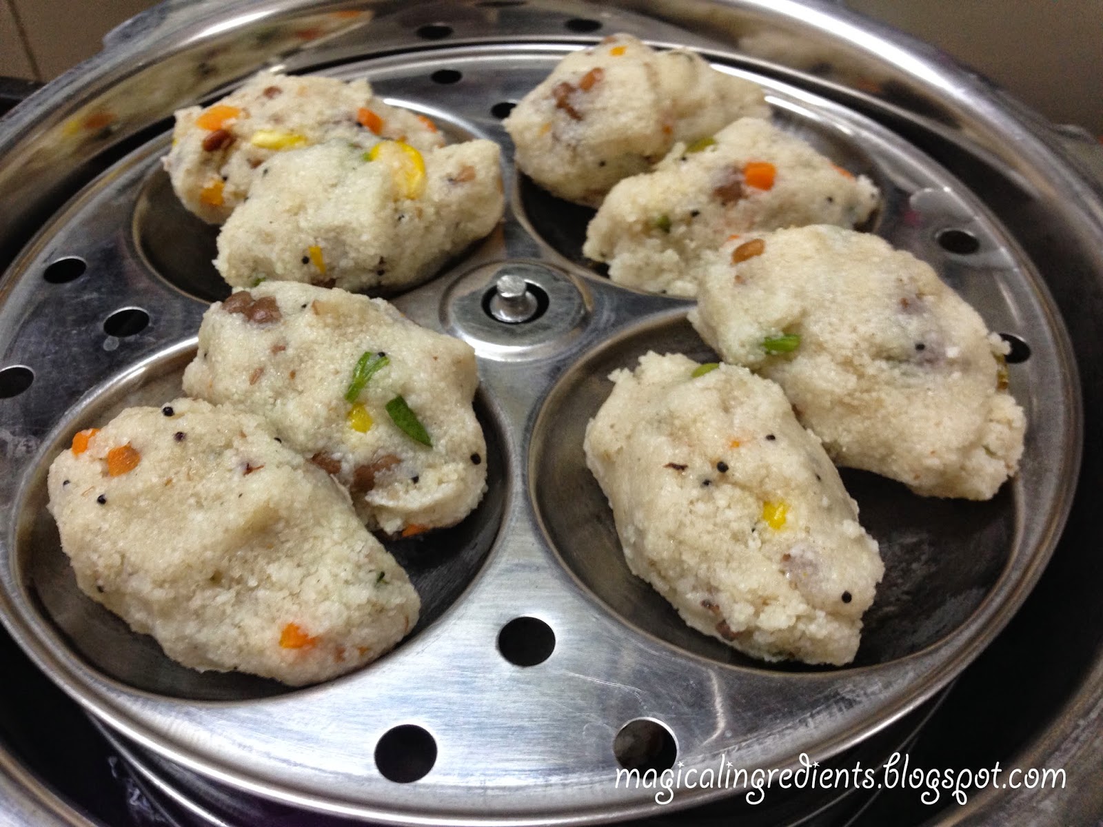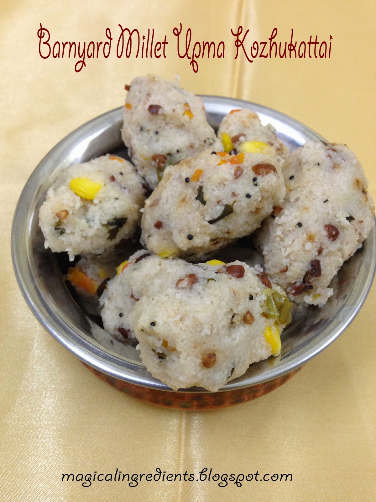 In south India, traditionally upma kozhukattais (steamed oval-shaped broken rice dumplings) are made with broken rice and they are very popular as tiffin or dinner in many families and are usually served with chutney, sambhar or gothsu. It can be served for breakfast too. They are shaped with hands and that's why it is called "pidi kozhukattai" in Tamil, ("pidi" means hold in Tamil) and since these kozhukattais are shaped and steamed when they are halfway to be made into upma, they are also called as upma kozhukattais. I have made a furthermore healthier version of this cute delicacy here with broken barnyard millet and a few veggies- a very healthy alternative.