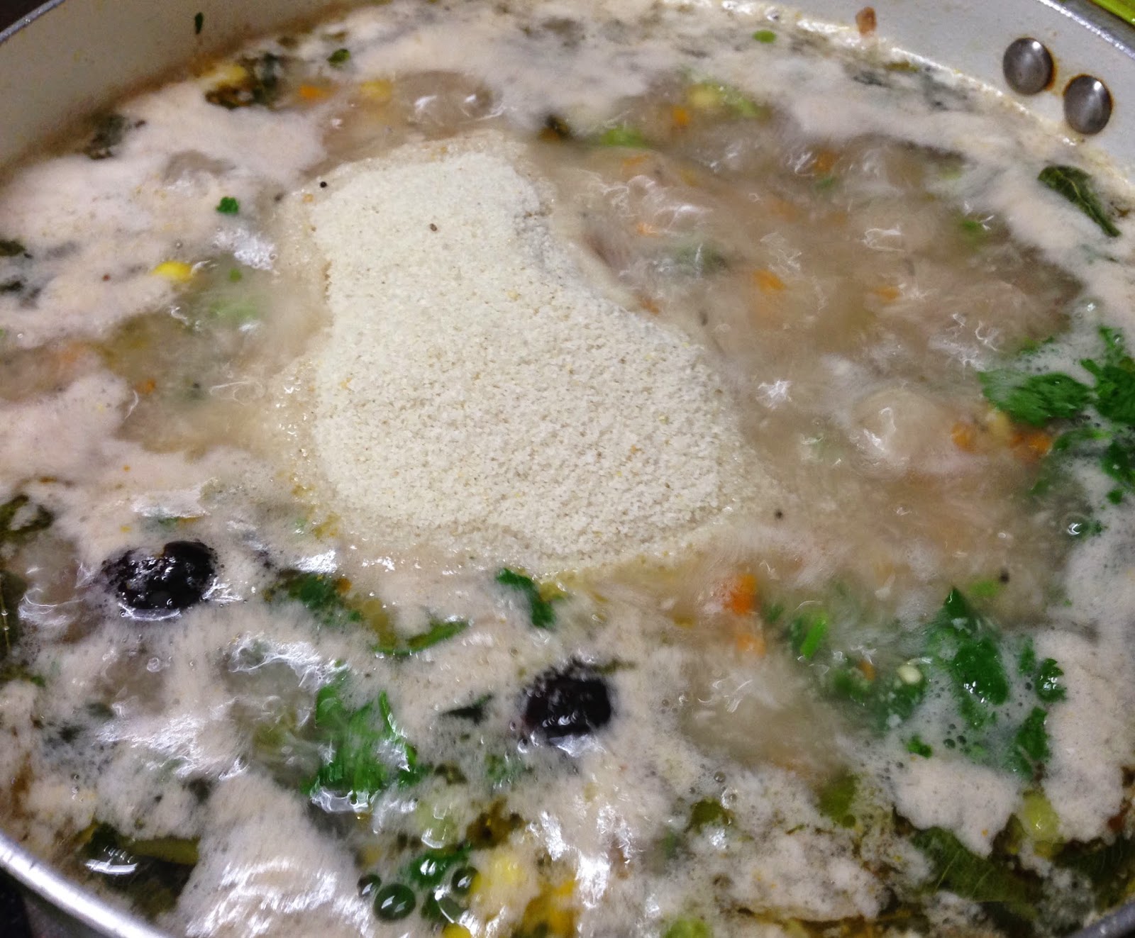 Heat oil in a pan and add the mustard seeds followed by urad dhal, channa dhal, peanuts, asafoetida, curry leaves, and green chillies. Fry till peanuts change to golden color and add the veggies, cooked cowpeas, and water. Add the coconut and when the water begins to boil add the barnyard millet rava.