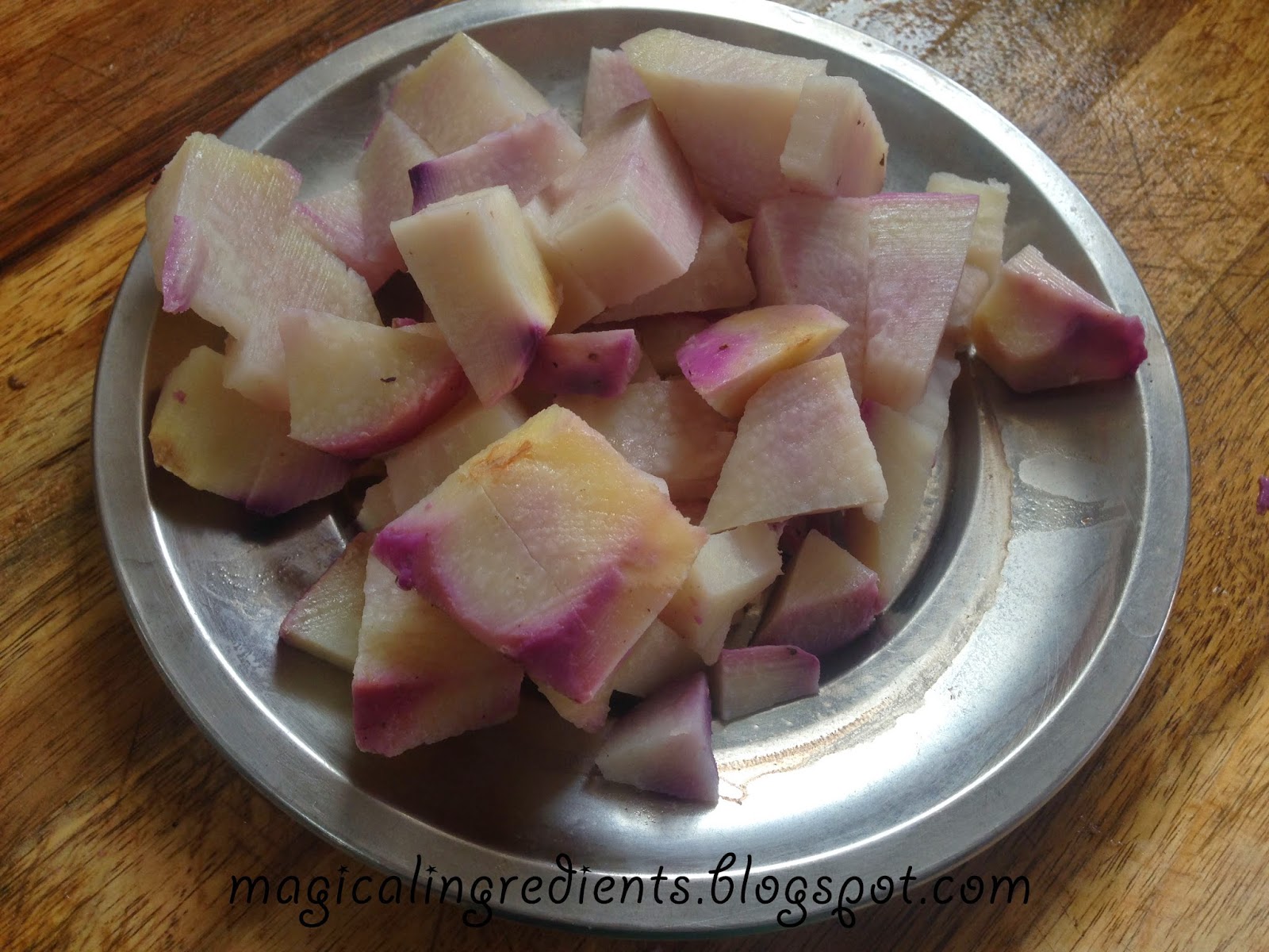 Pressure cook the dhal (add 1/8 tsp turmeric powder to the dhal and then cook) and the tuber separately (You can pressure cook as 2 or 3 big chunks, then when cool, peel and then chop to chunks, quantity is 1 cup).