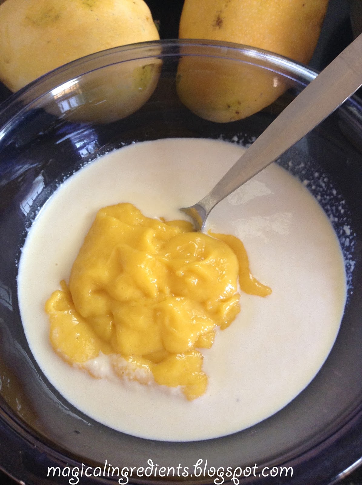 Transfer to a bowl. Next, puree the mangoes and add it to the cream. Gently fold in to mix.