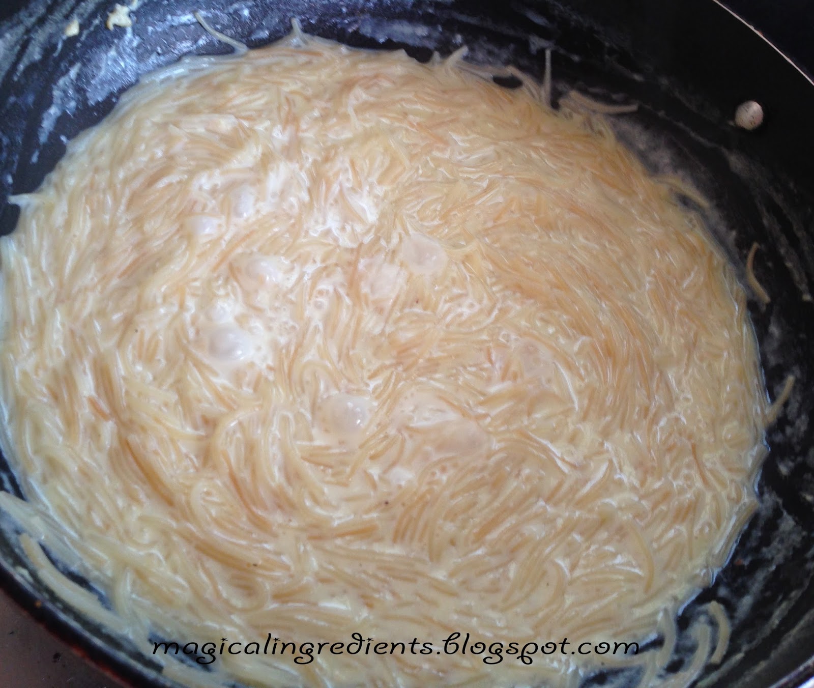The vermicelli will be cooked and now add the condensed milk and the rest of the milk.