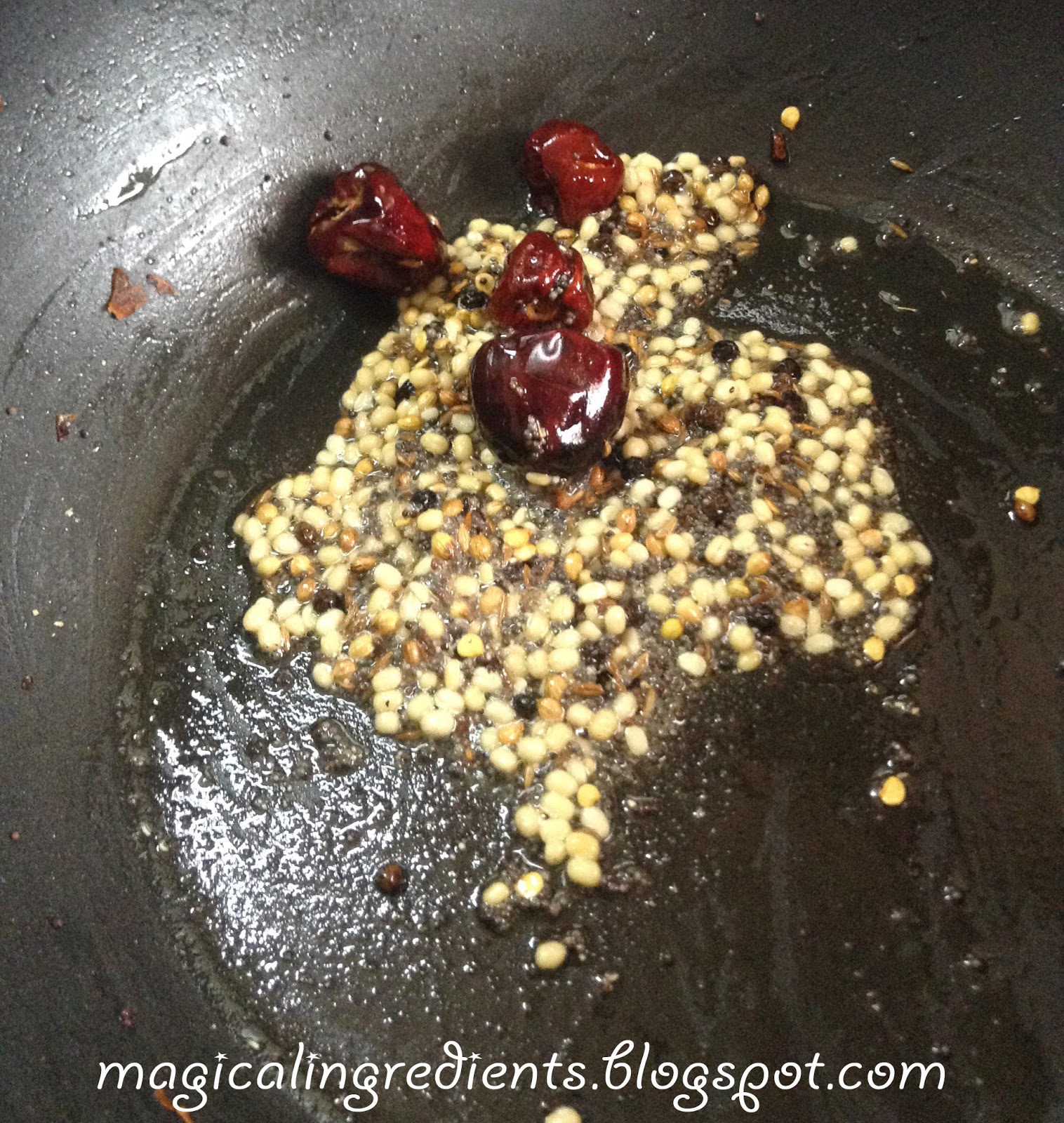 Heat oil in a pan. Add all the ingredients except, leaves, salt, tamarind. Fry them till golden brown and keep it aside.