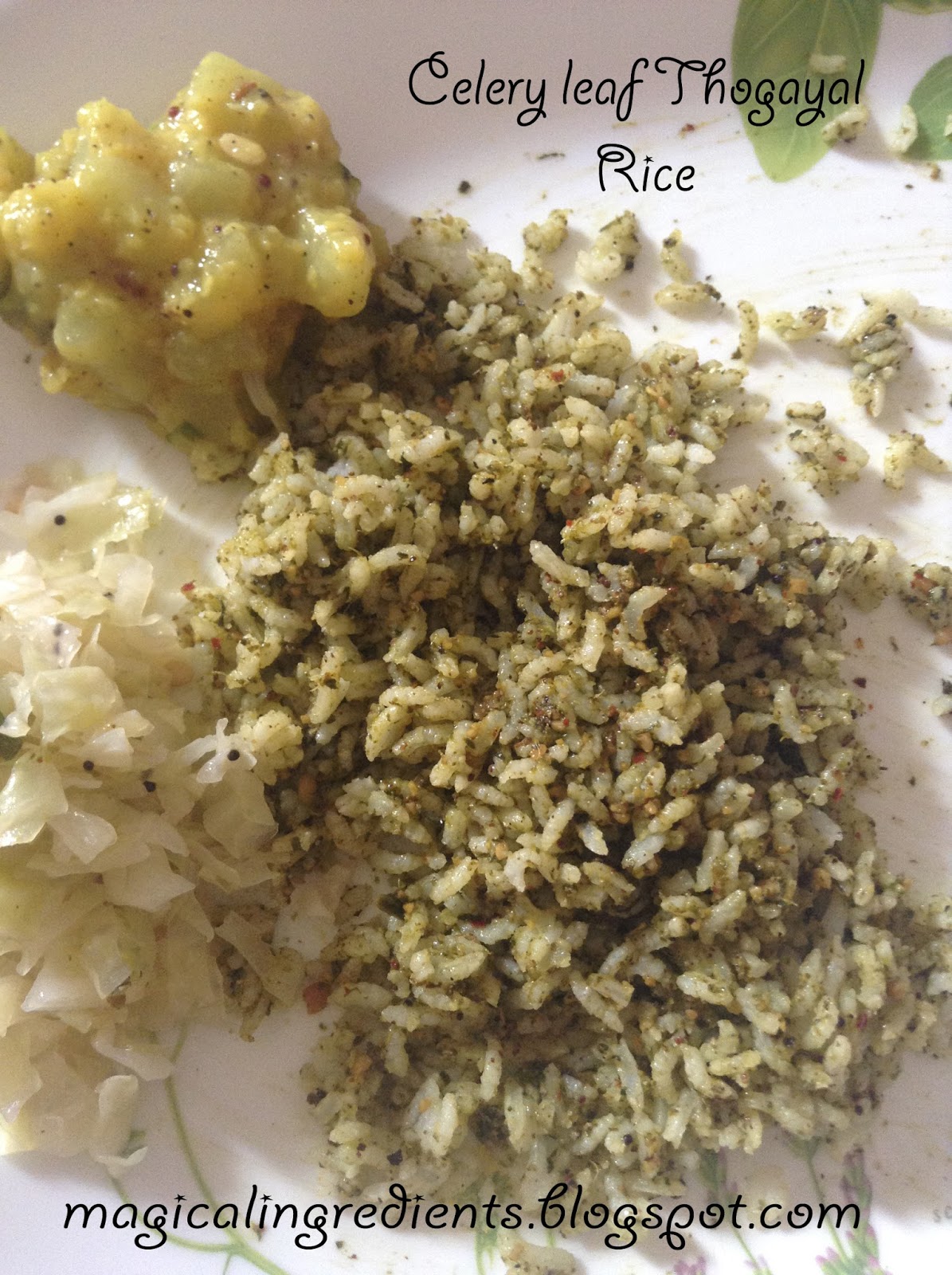 The celery leaves are mostly thrown away but they are delicious and nutritious. They are packed with the intense flavor of celery. Here is a simple desi style recipe using celery leaves -celery leaves chutney or thogayal, which is a kind of pesto. It just takes 10 -15 min to make this and tastes great with rice.