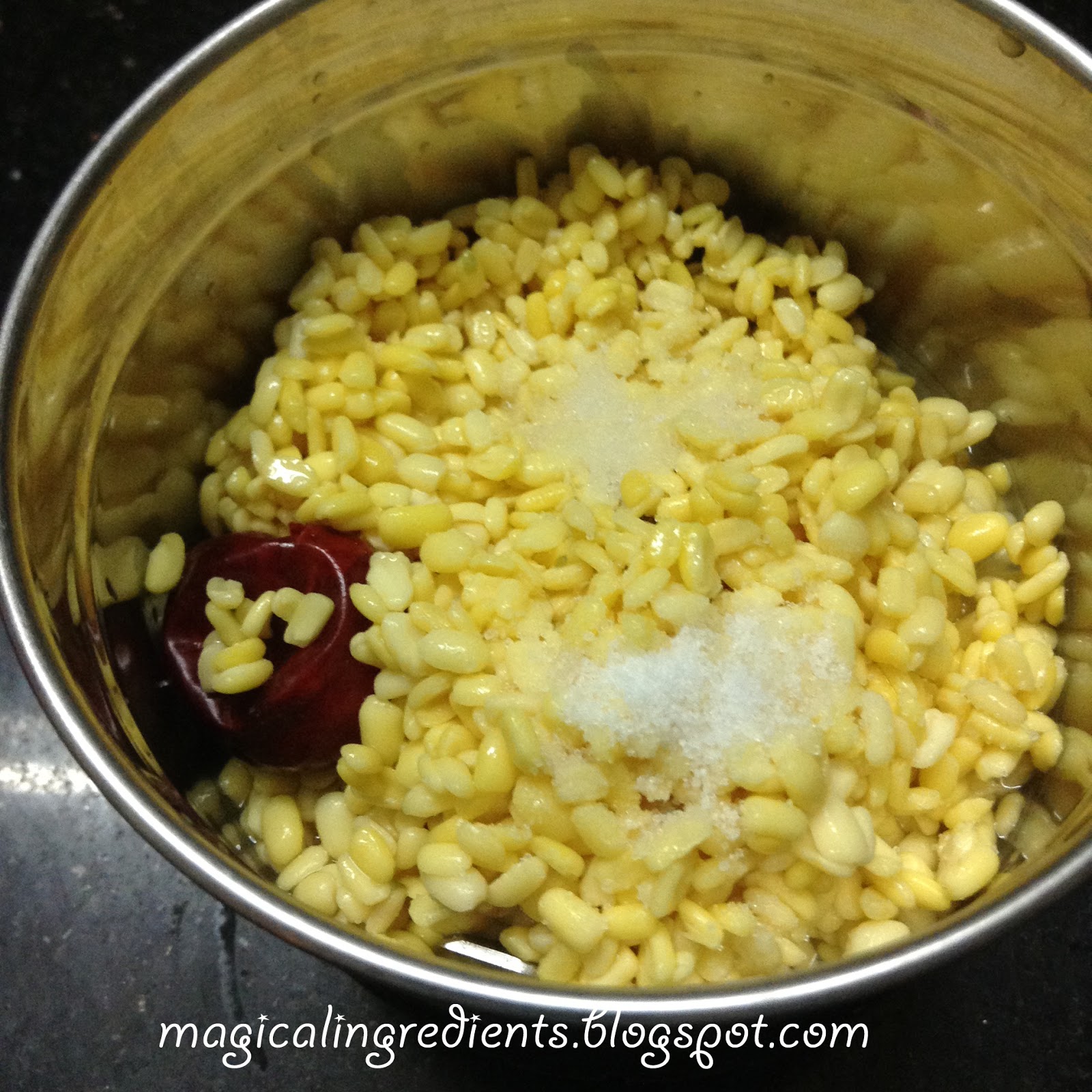 Soak the split moong dhal with red chilli for 30 min. To the soaked moong and chilli add 1/8 tsp asafoetida, salt, and grind to a coarse texture.