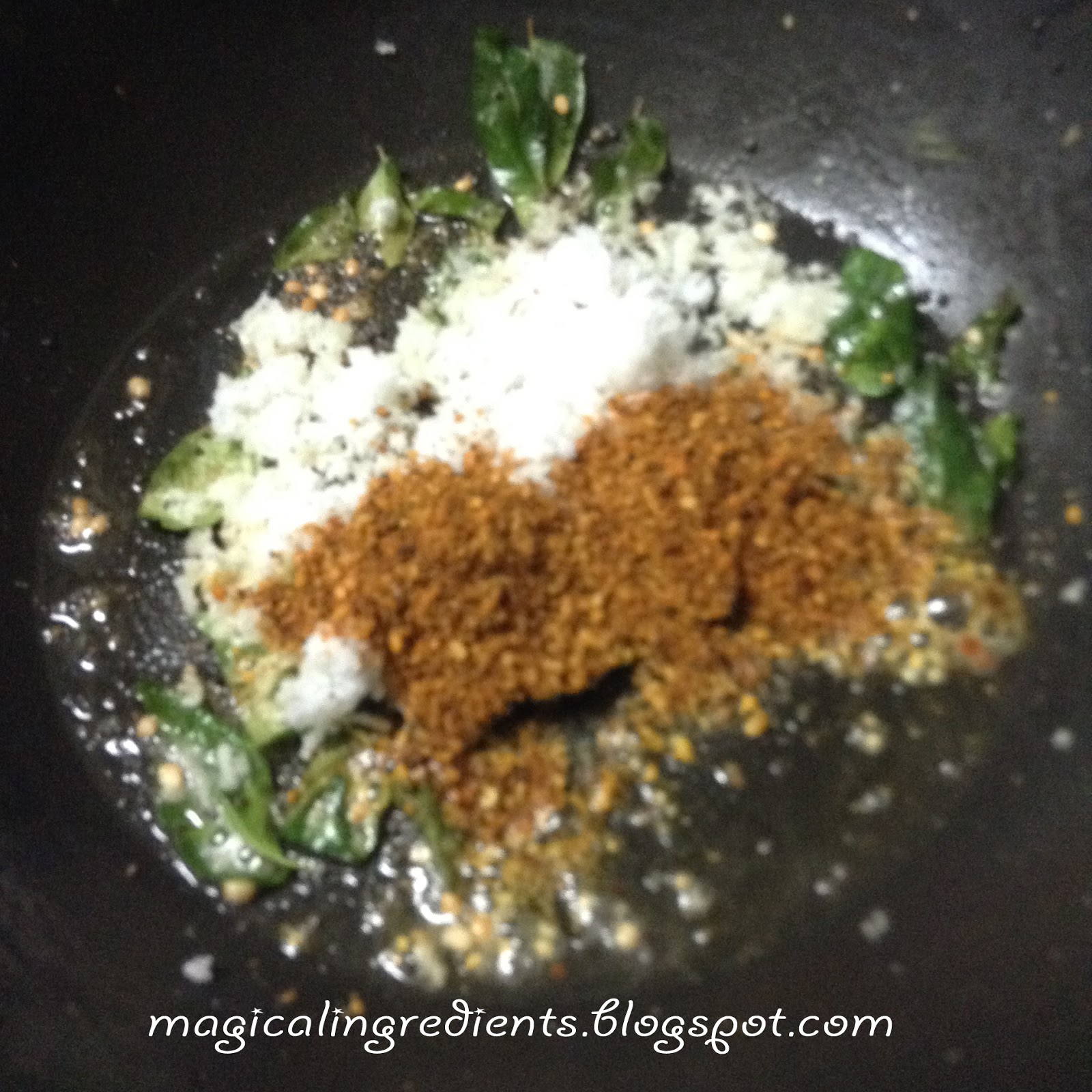 When the seasoning is done, to that add the coconut and idli chilli powder.