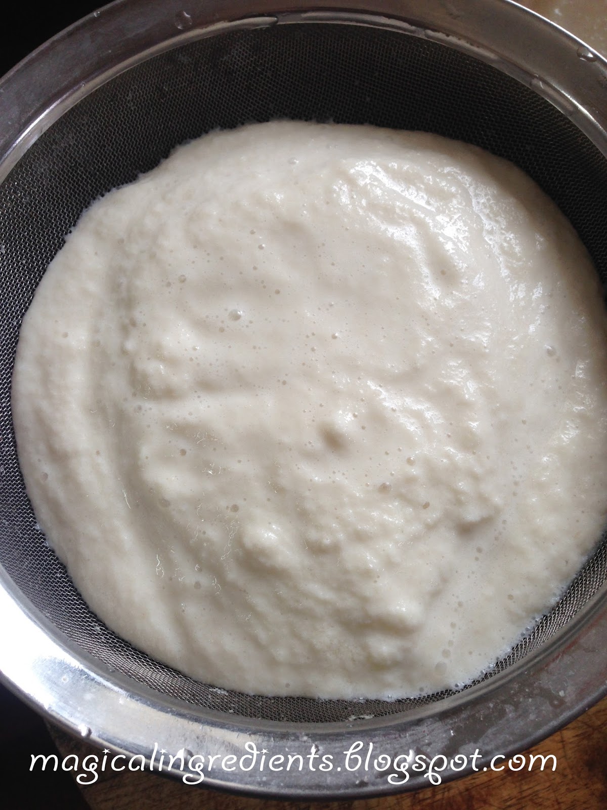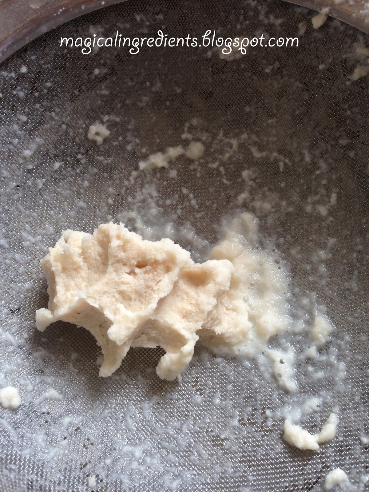 Filter the puree, squeeze completely, and discard the fibrous part. Add a little water while doing this.