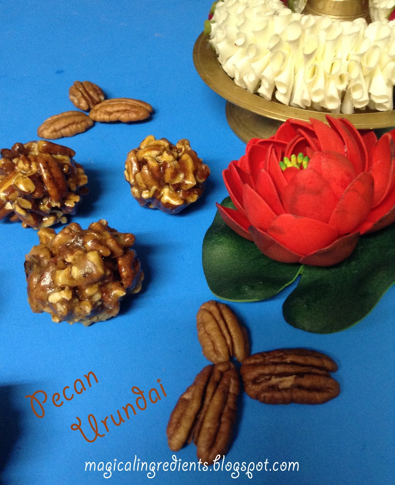 Thinking of all those days, I made pecan ladoo aka pecan urundai instead of peanut ladoo (shhh....this too is my favorite). Pecans are delicious and have a buttery taste. It is rich in Vitamin E and polyphenolic antioxidants like ellagic acid. So please try to include it in your diet. The ladoos, I made, came out best and it got emptied completely within a few minutes. When my son asked me, "Could I have one for my school snack tomorrow?", Oh! wow! was all my expression, as he has never asked for any ladoos before and I decided to make another batch. Okay....here is the simple recipe.