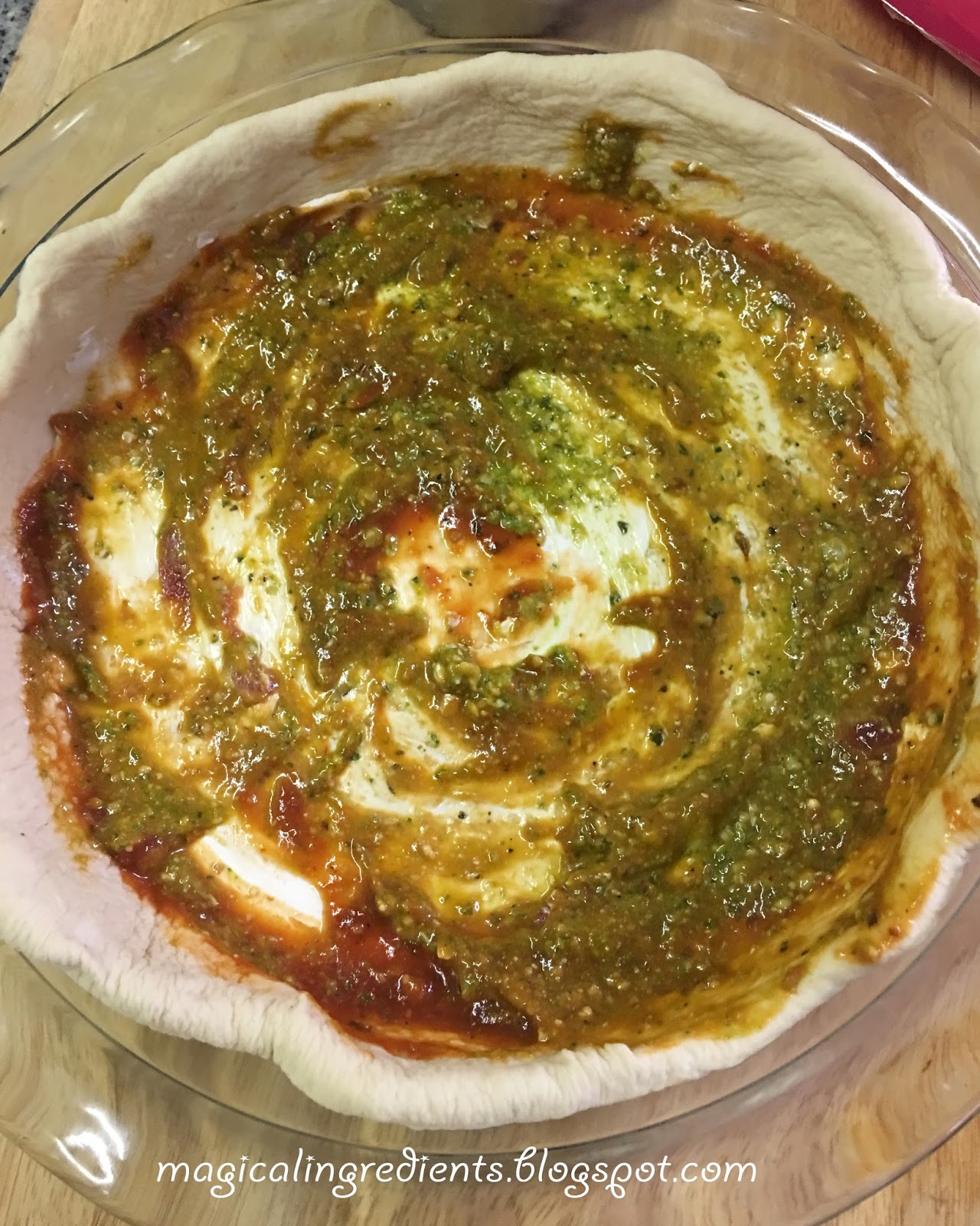 Spread a couple of teaspoons of cream cheese to the dough base. Add a few teaspoons of sauce and pesto (whichever you prefer) and spread it.