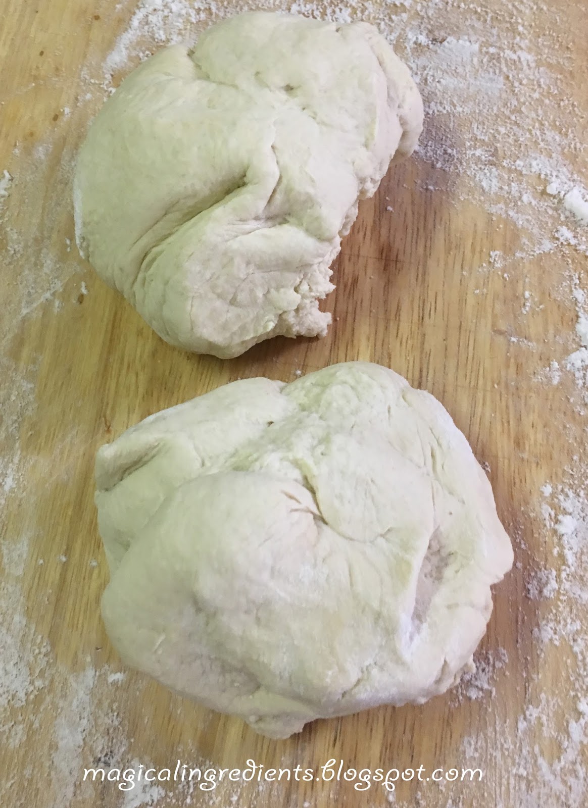 Once the cycle is complete (or proofing is over), remove the dough from the machine on to a floured surface. Punch the dough (which is full of fun for kids), fold, and repeat a couple of times. Divide the dough into two. One portion is used to make the pizza pie. The other portion can be wrapped and refrigerated to use later (to make pizza crust).