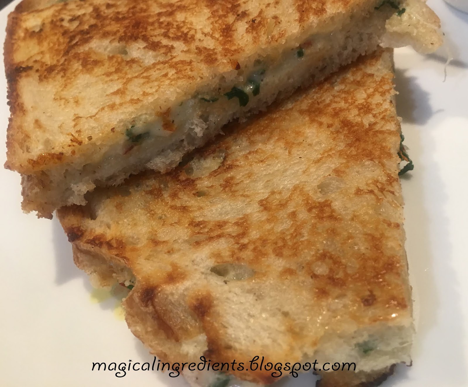 In this particular recipe, I have used a mixture of ricotta, mozzarella, and parmesan cheese. This is similar to any cheese mix used for lasagna. Its another favorite in our home and so is this grilled cheese. Added little sun-dried tomatoes and sauteed spinach to make it even healthier. The kids love measuring and mixing the different cheeses which are always fun. Remember, cheese brings a smile on kids' faces. I have to admit the fact that I get very little time to click a picture as it gets taken by another member. I just have to be very quick in clicking :-). I guess I will stop my ramblings here and go to the recipe.