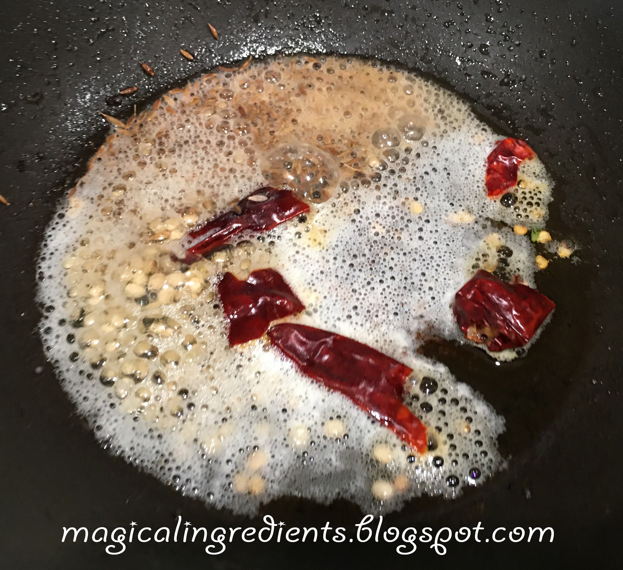 In a small pan, melt the ghee. When it is hot add the torn red chilli, mustard seeds. When it splutters, add split urad dhal and, cumin. Add hing and pour it into the mashed amaranth.