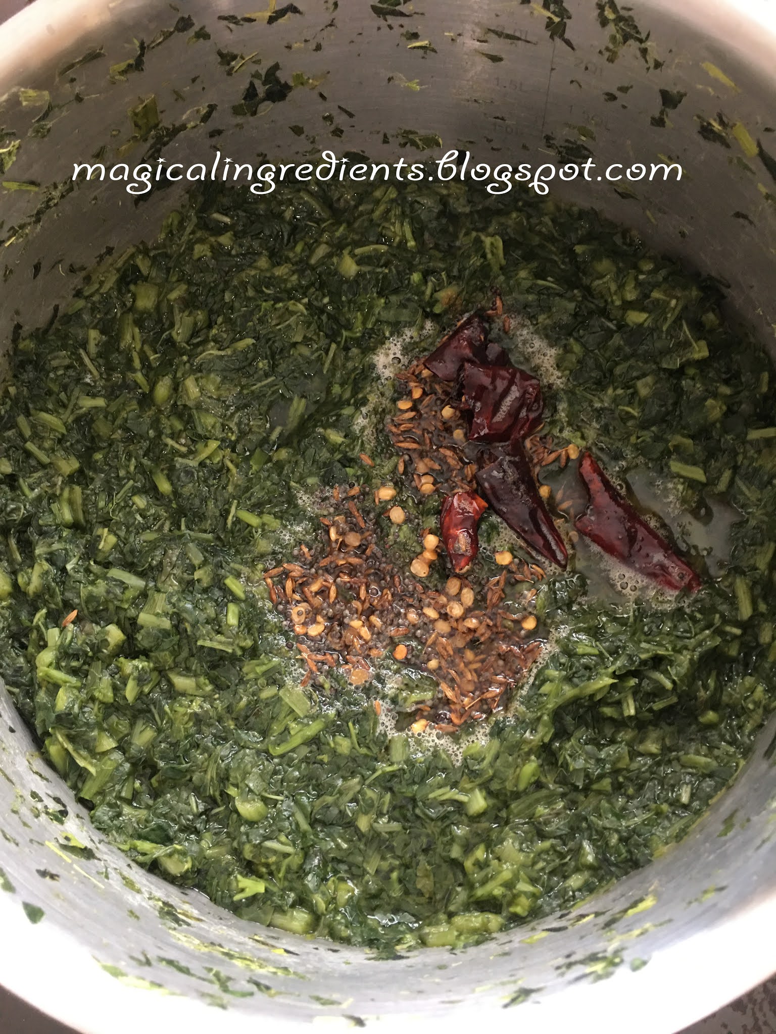 A little hing can be added initially too (when you begin cooking the leaves). That gives an enhanced taste. My mom cooks like that and that's my favorite.