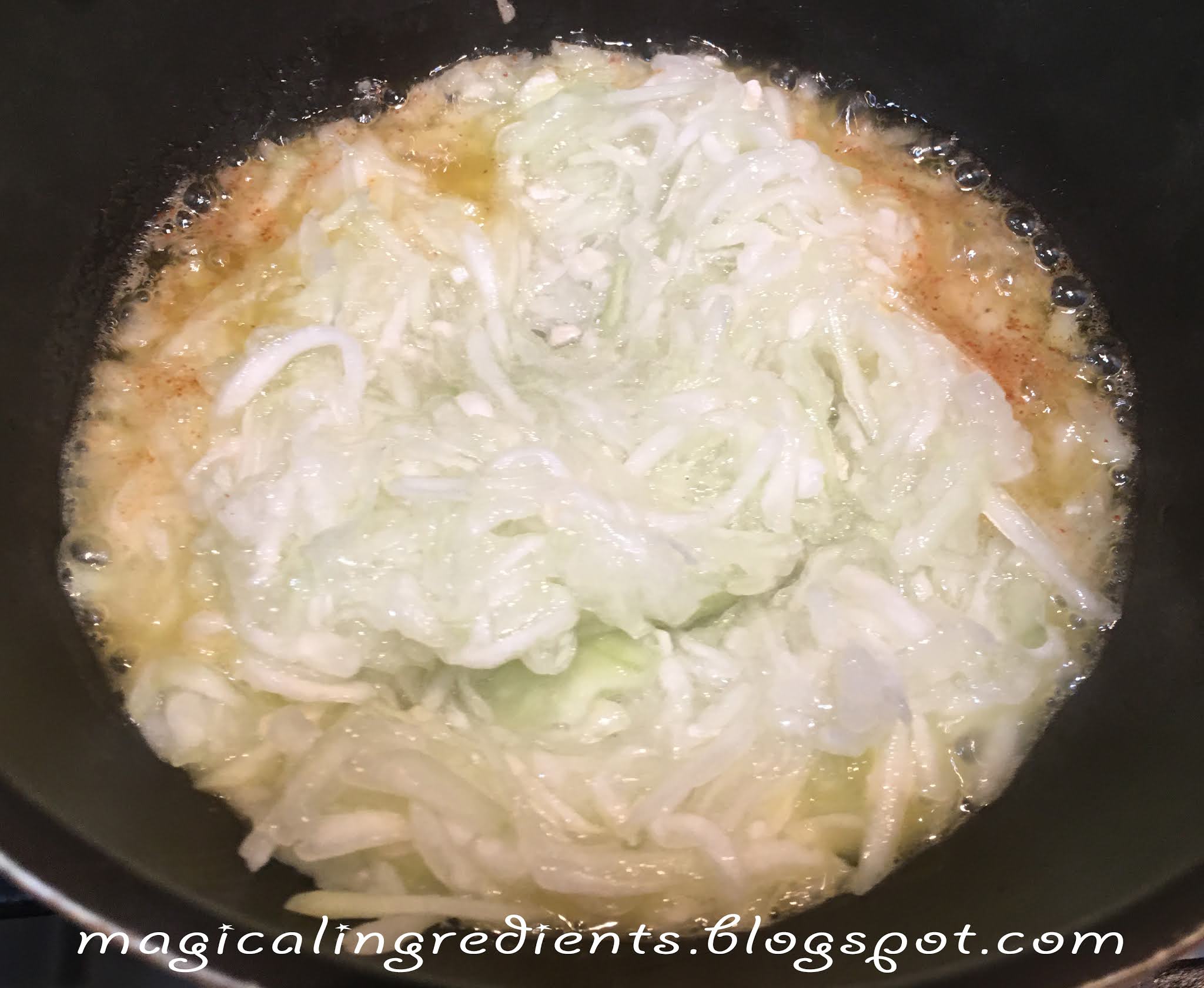 In the meantime, melt 1 tsp ghee in a pan, and add the grated bottle gourd. Saute till it is translucent, about 7 min.