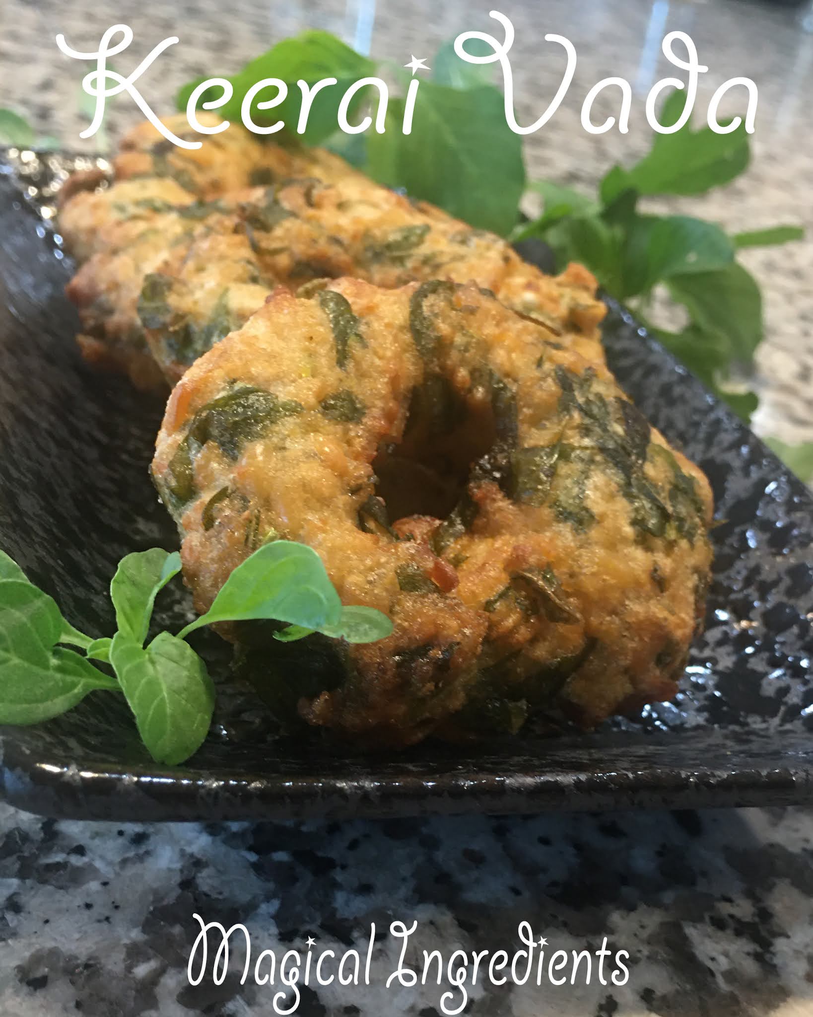 Keerai (aka amaranth) vada is a very common snack in many homes as well as restaurants. This vada is a slight variant of the medhu vada. It is neither as fluffy as the medhu vada nor very crunchy like the Hanuman vada (the one made with black urad dhal). It is in between these two, but quite an enjoyable snack. These are a little thicker than the Hanuman vada but less crunchy. I had these at the ID restaurant in Vadapalani, Chennai maybe 6 years ago with my school friends where we met after so many years. I tried to recreate it and started liking this version. I make a bit softer than the restaurant version as my kids are not fond of the crunchy form. Adding spinach also increases the nutritional value of the protein-rich snack. Since this recipe doesn't use onion or garlic, it is perfect for Neivedhyam in our homes. I have been trying to post this for quite some time. For the blogging marathon #117, I had to post Neivedhyam recipes in X, part of the A-Z series. In Assamese, xaak means greens. Amaranth greens are always used in our traditional keerai vada and hence a perfect choice for the post as well as neivedhyam. So the opportunity is perfect to post my style of keerai vada or xaak vada. I used the tender amaranth greens growing in my backyard for this recipe (not to mention that this is the third time I am making keerai vadai in this growing season :-)). This vada is a little crispy on the outside with a little chewy and soft inside. They are flat with a prominent hole in the middle, can compare to a very thin savory doughnut:-). The batter should be thick and hence care must be taken not to add much of water while grinding the dhals.