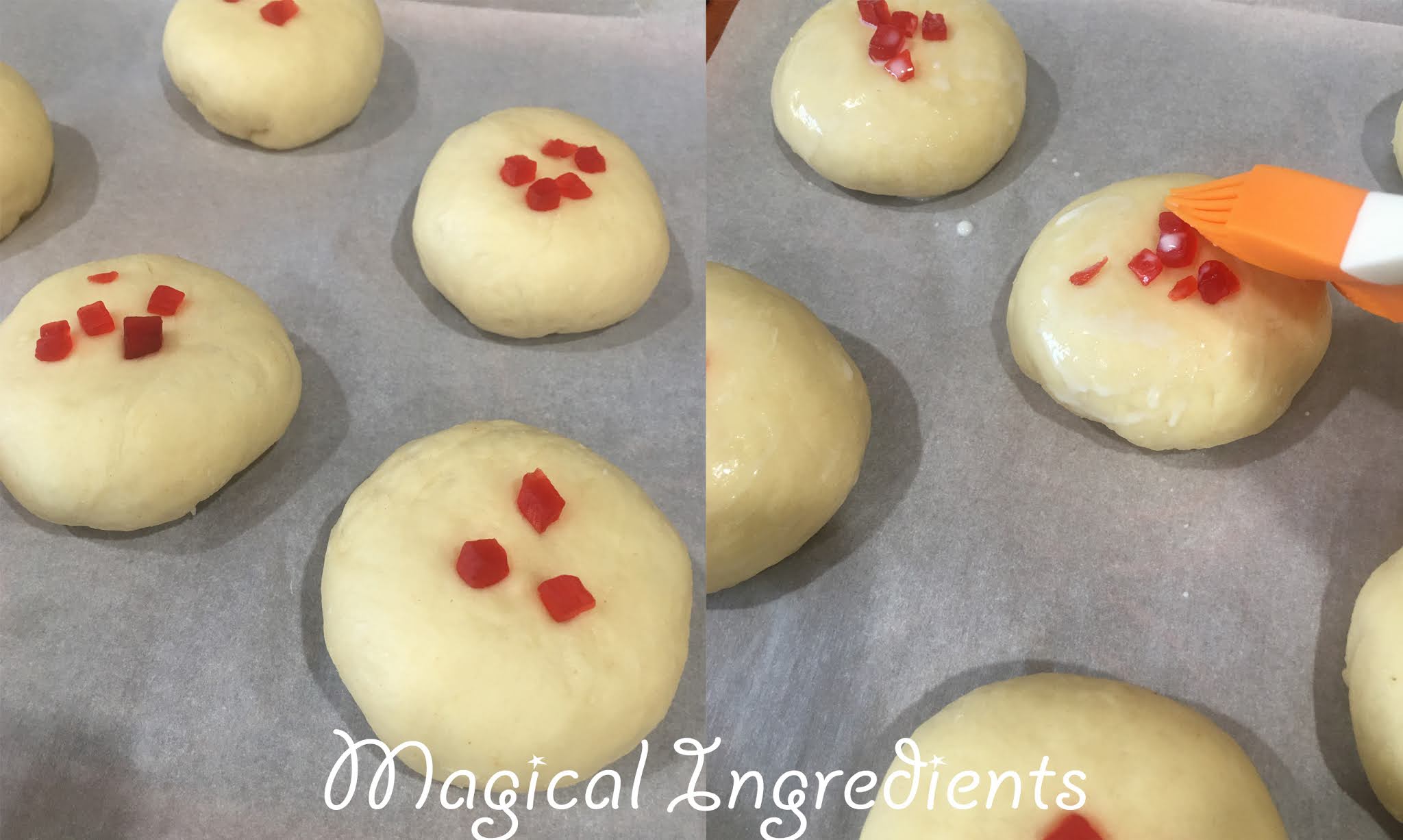 Cover with a towel and let it rise for 30 min. Preheat the oven to 350degrees F. After the second rise, brush the top of the buns with milk.