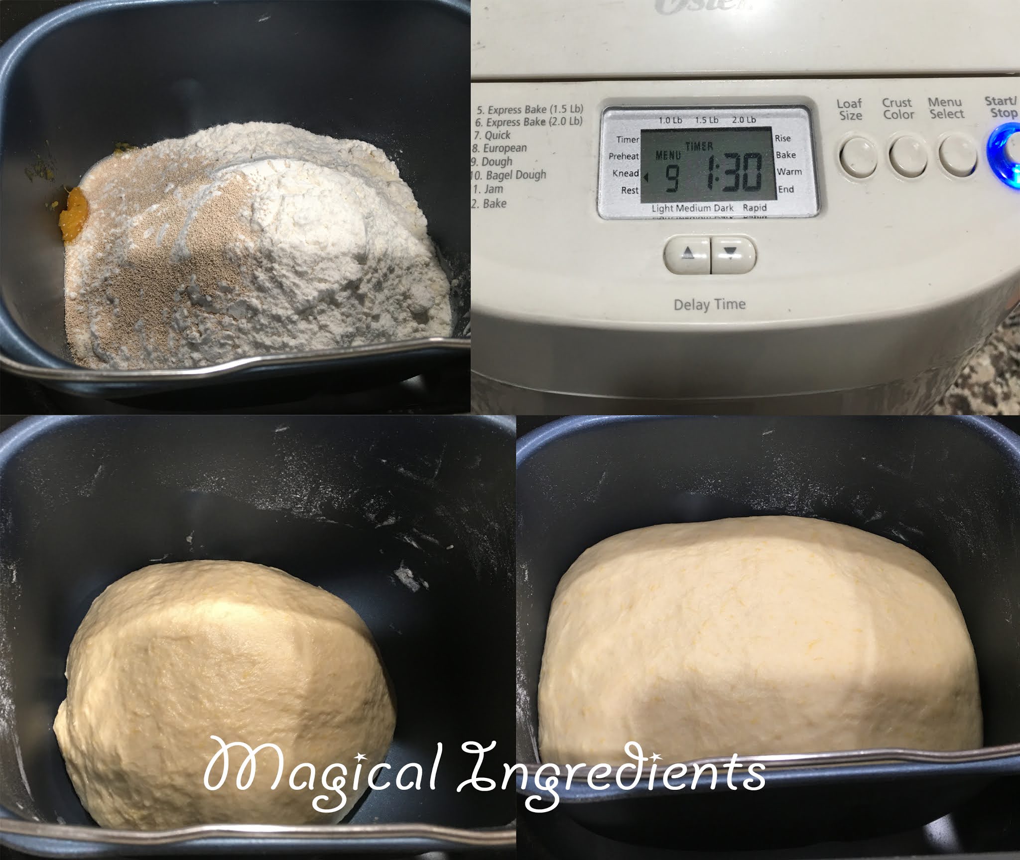 Add the wet ingredients followed by the dried ones to the pan of the bread machine. Finally, add yeast and set it on the dough cycle.