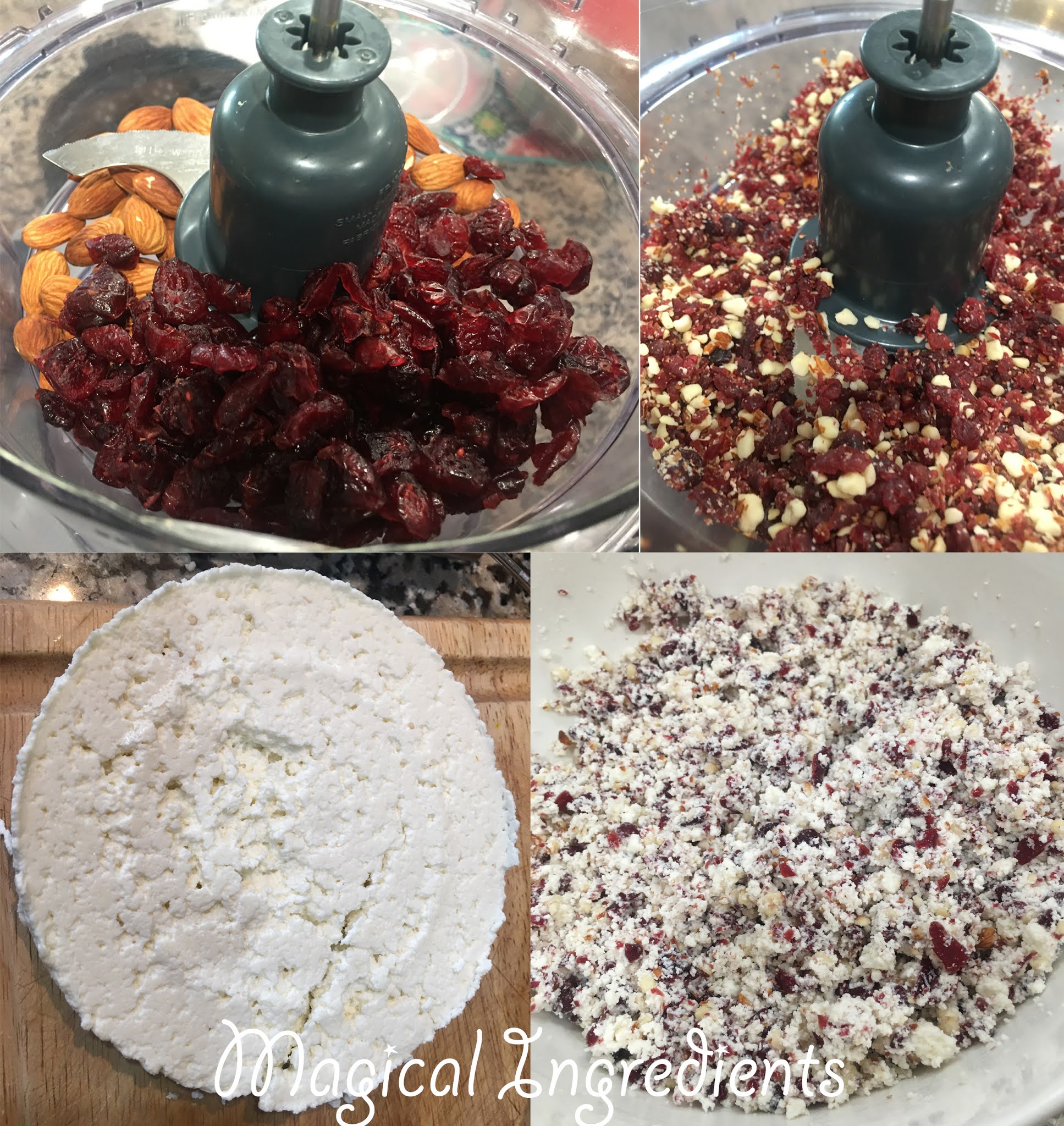 Pulse the dried cranberries and almonds in a food processor to a coarse texture, but not powdery. Transfer to a bowl, and add the paneer. Mix well and set aside in the refrigerator.