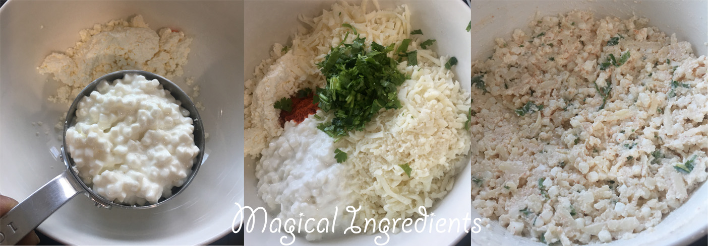 In a bowl, add the fresh paneer, grated paneer, cottage cheese, mozzarella, salt, chilli powder, and cilantro. Mix well and keep aside.