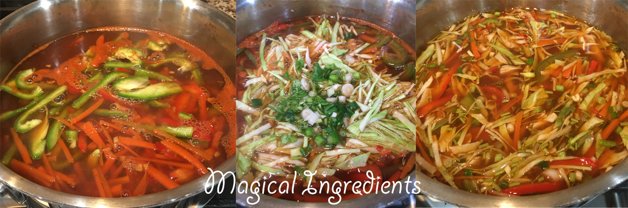 Add the bell peppers simmer for 2-3 minutes. Then add cabbage, the white parts of the green onions, cilantro stems,  and simmer for 1-2 minutes.  Remove from flame, add the chopped cilantro and sliced green onions.