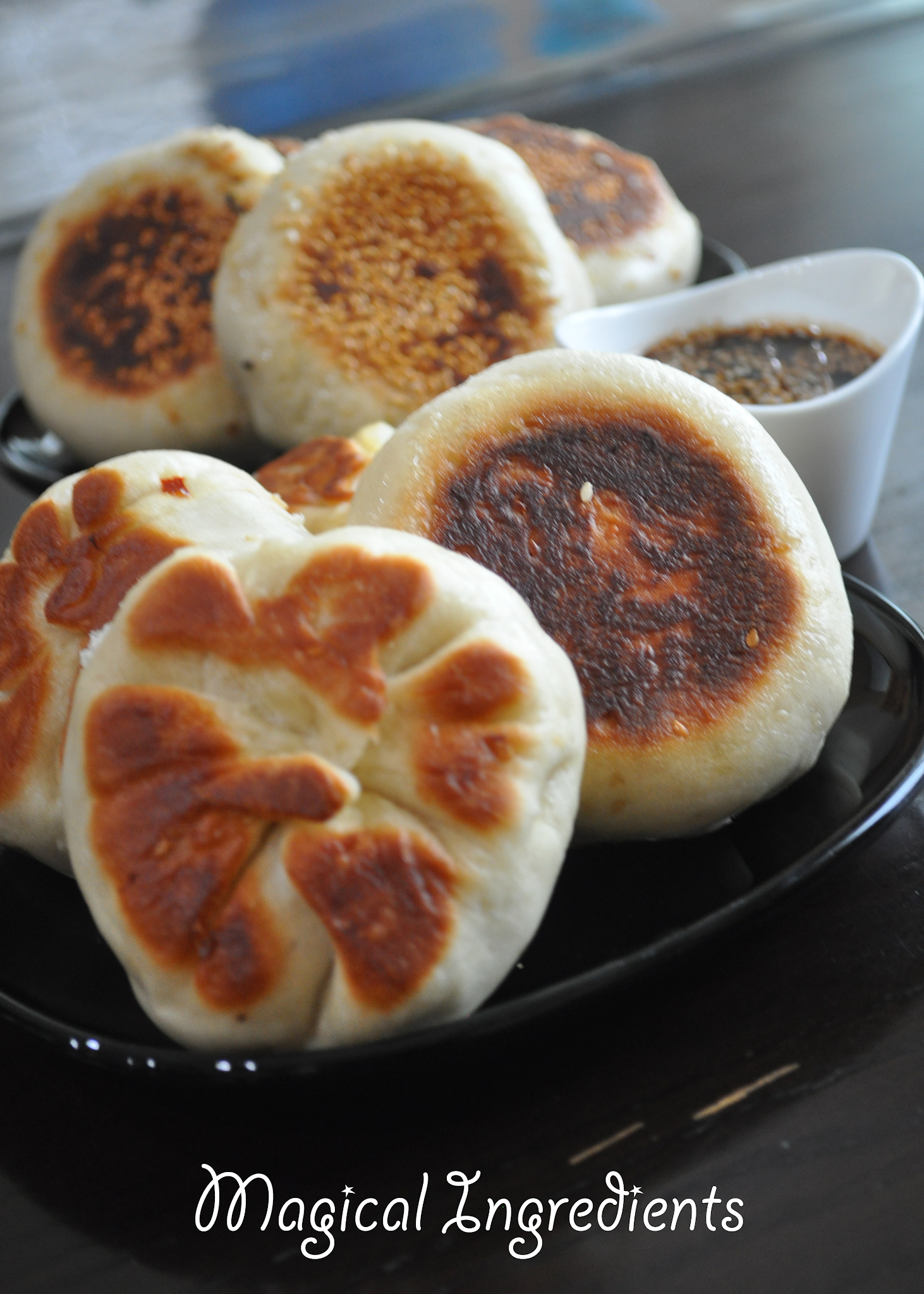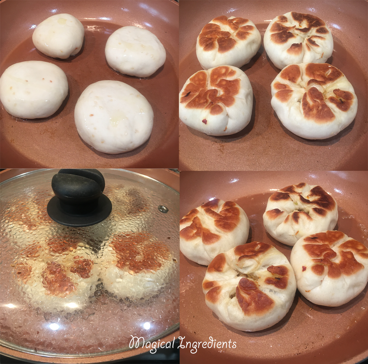 Heat a pan. Add 1 tbsp oil, cook the buns for 3-4 minutes on low-medium heat. Flip and cook the other side for 3 minutes. Pour 1/4 cup water and immediately cover the pan with a  lid to steam. Steam till all the water evaporates, roughly 4-5 minutes. Repeat the process with the rest of the buns.
