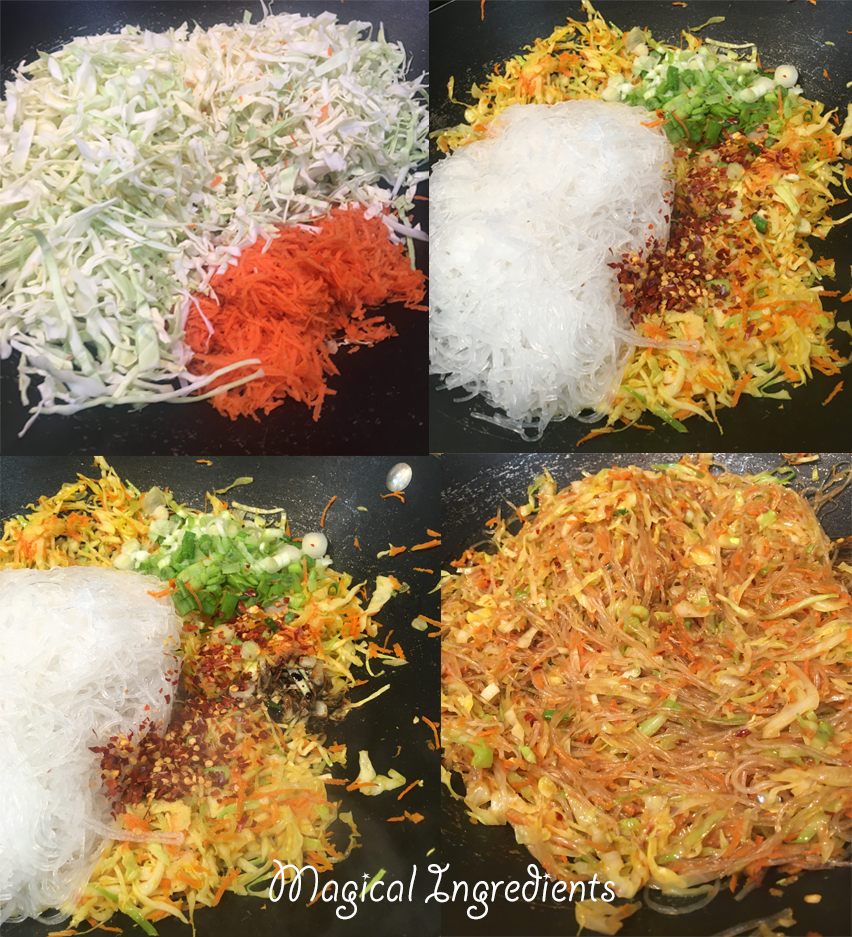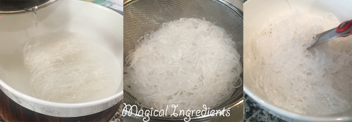 Pour hot water to the noodles and soak for 2-3 minutes. Drain and cut the noodles to smaller length. Keep aside.