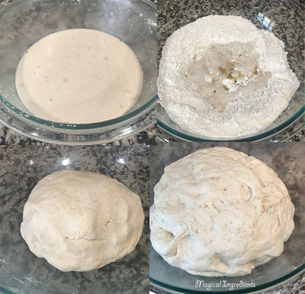 Activate the yeast in water with sugar. Mix in a bowl the flour, salt, sesame oil, and seeds. Make a well in the center and add the yeast mixture. Knead to a dough. Apply oil on the bowl and let the dough rise for 2 hours.