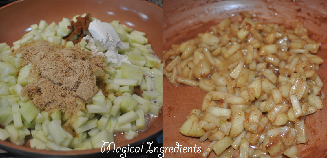 In the meantime, heat butter in a pan. Add all the ingredients for the apple topping and cook for 7 minutes. Keep aside.
