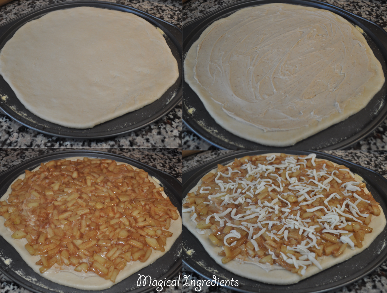 Preheat the oven to 400 degrees F. After an hour, punch the dough, knead a couple of times. Roll into a 12-in circle. Sprinkle a little cornmeal on a 12-in pizza pan. Transfer the dough to the pan. Spread the cream cheese sauce. Now add the apple topping evenly on top of the cream cheese. Sprinkle mozzarella. Bake for 10 minutes.