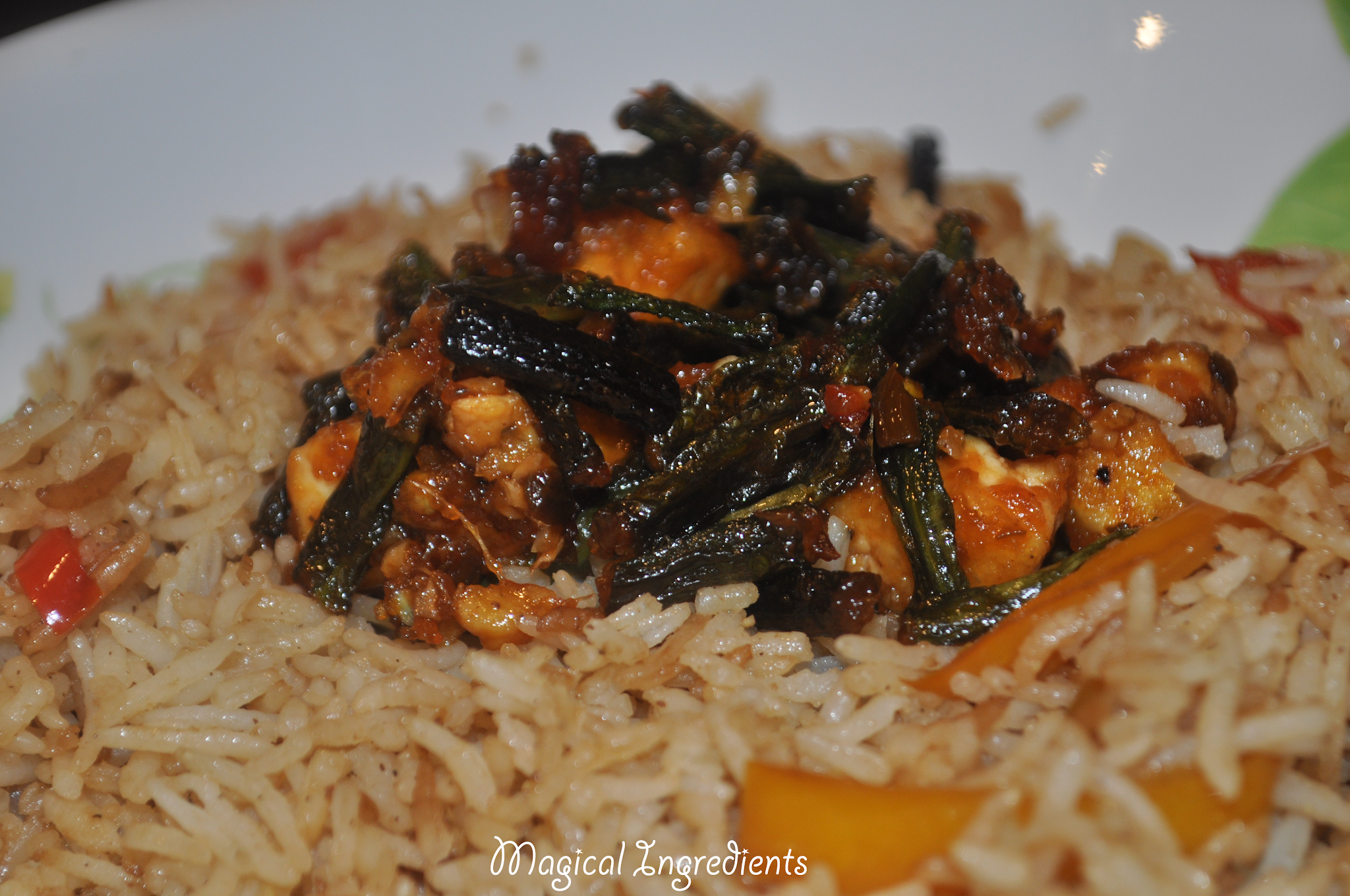 Long green beans is also called as Karamani in Tamil. We usually make curries with that for chapathi or rice. Our usual dry curries are with coconut and with dal (we call parupusli). We also make sambhar or gravy kind curries with the vegetable. I have made only our traditional curries with this vegetable. So when I saw this recipe for the #LNYCOOKOFF organized by Melissa's Produce, I wanted to give a try and we loved it. Of course I made changes to the recipe. I didn't have rice wine and also didn't add the brown sugar. I wanted a spicy one and in fact added a teaspoon of siracha paste (and a little bit more in my plate). I added tofu to have a balanced meal as I served with colored pepper fried rice.