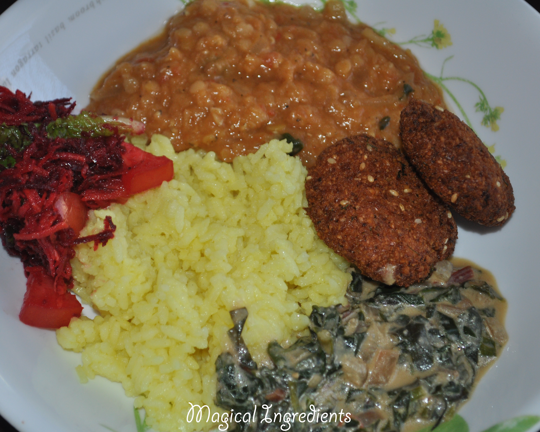 In addition to Tamia, we tried Gourassa. They were similar to pancakes or dosa. I came to know that they use chard and peanut butter to make a stew. I used the chard that were growing in my backyard and enjoyed the stew. Their red lentil curry, Addas, was very similar to our dal. In fact, We enjoyed a great lunch with Sudanese rice, Addas, Tamia, Chard-peanut butter stew, and beetroot salata. I wanted to try Ful Medames and Kisra (fermented jowar flatbread) too, but definitely try sometime soon.