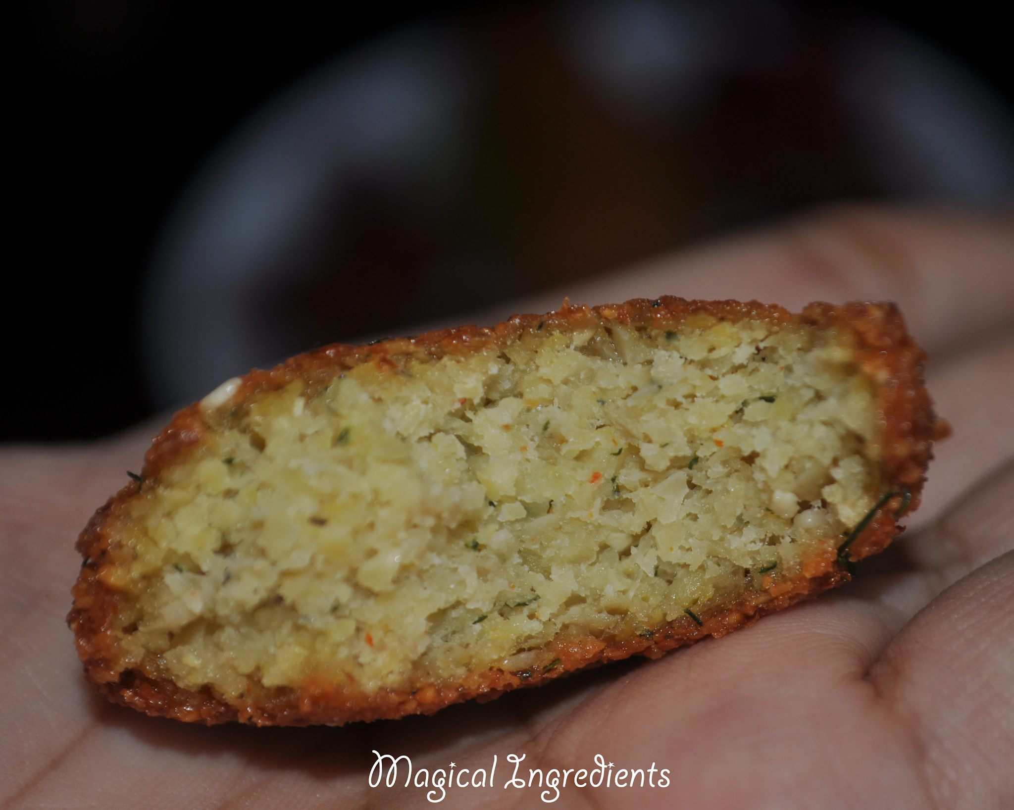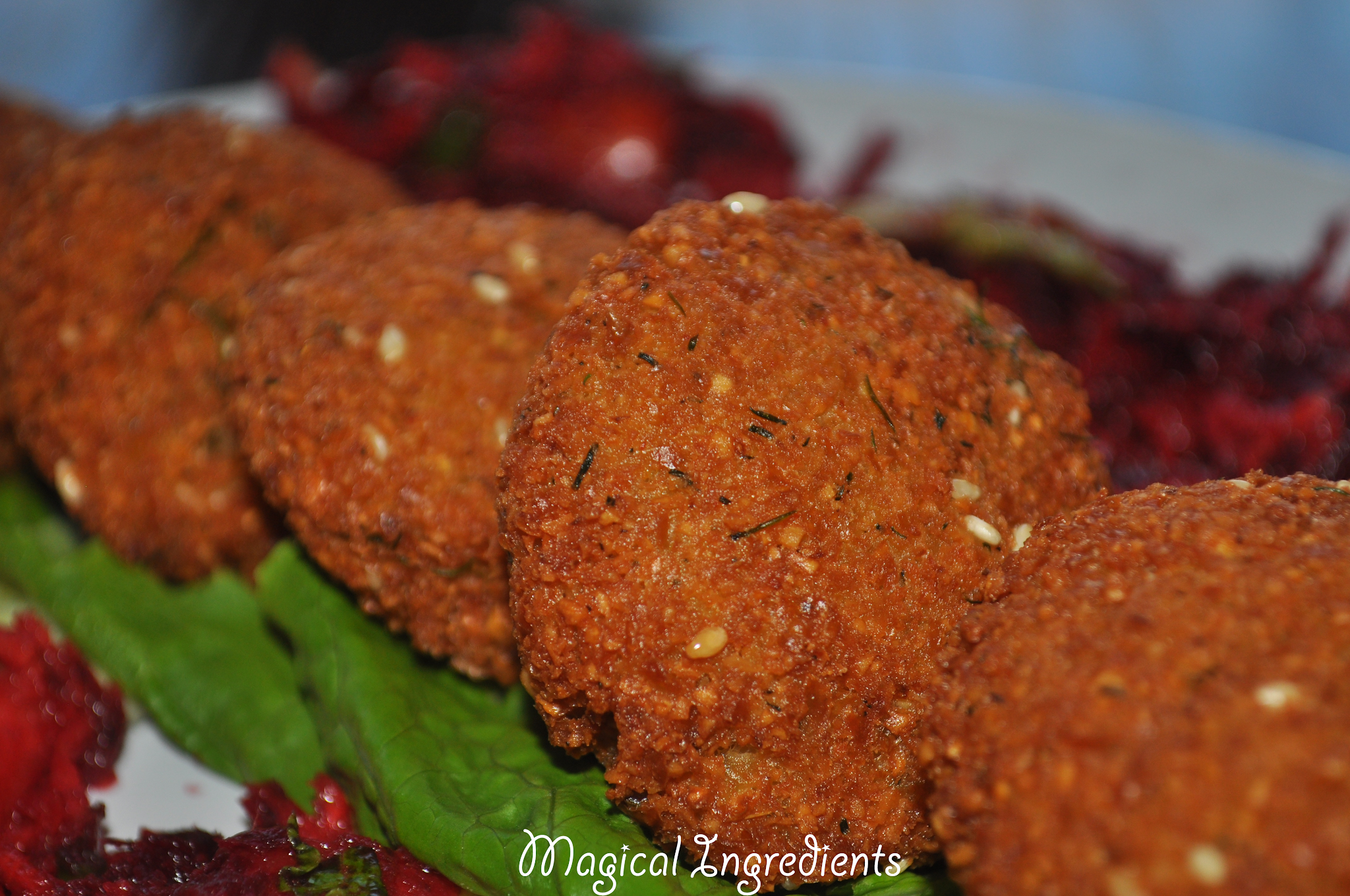 Soak the garbanzo beans overnight or for 8 hours. Wash and drain the water. Add the soaked garbanzos, salt, garlic, 2 tbsp dill, salt, 1 or 2 tbsp water, onion, cayenne, and black pepper powder to the food processor. Grind to a coarse mixture similar to falafel. Transfer to a bowl and add 1 tbsp dill, toasted sesame, and flour. Mix thoroughly.