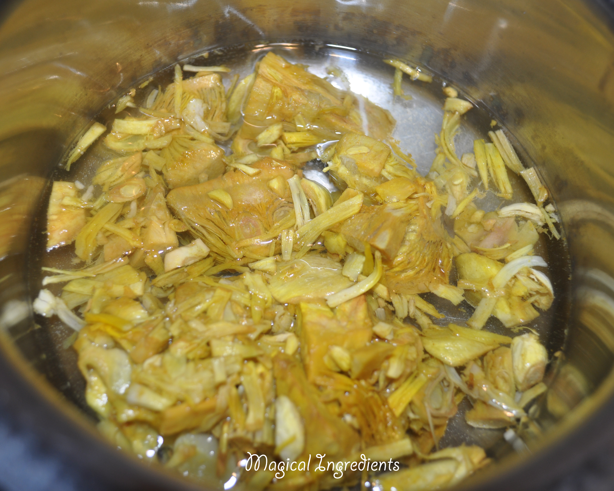 Boil the frozen tender jackfruit for 5 min, drain and keep aside.
