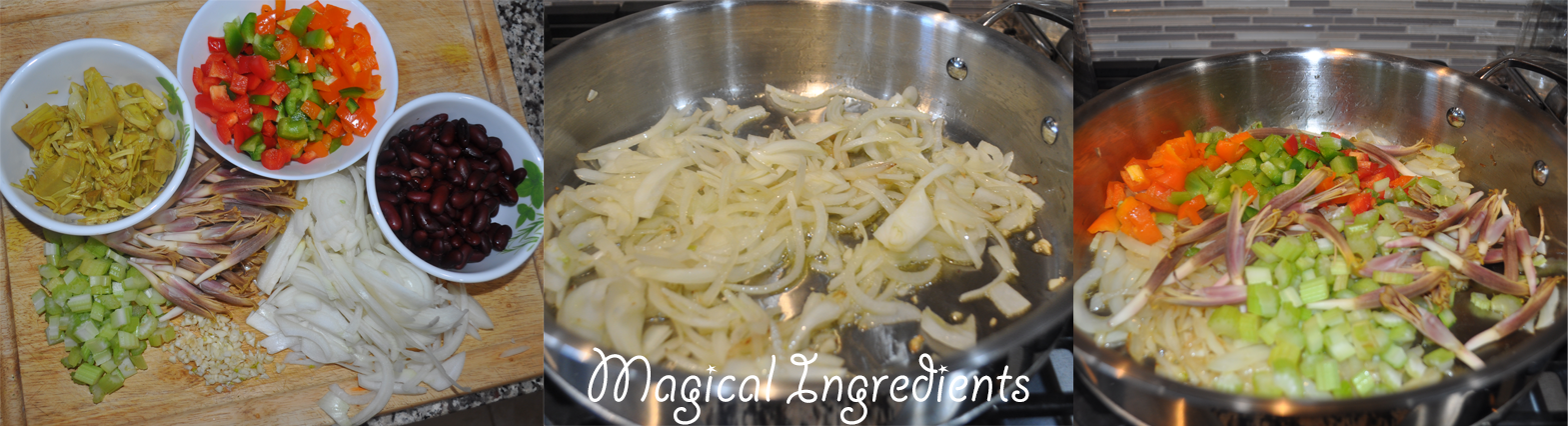 In a heavy-bottomed pan, heat oil. Add onion and garlic. Sauté for 3 minutes. Add the chopped peppers, celery, banana florets, and sauté for 2-3 minutes.