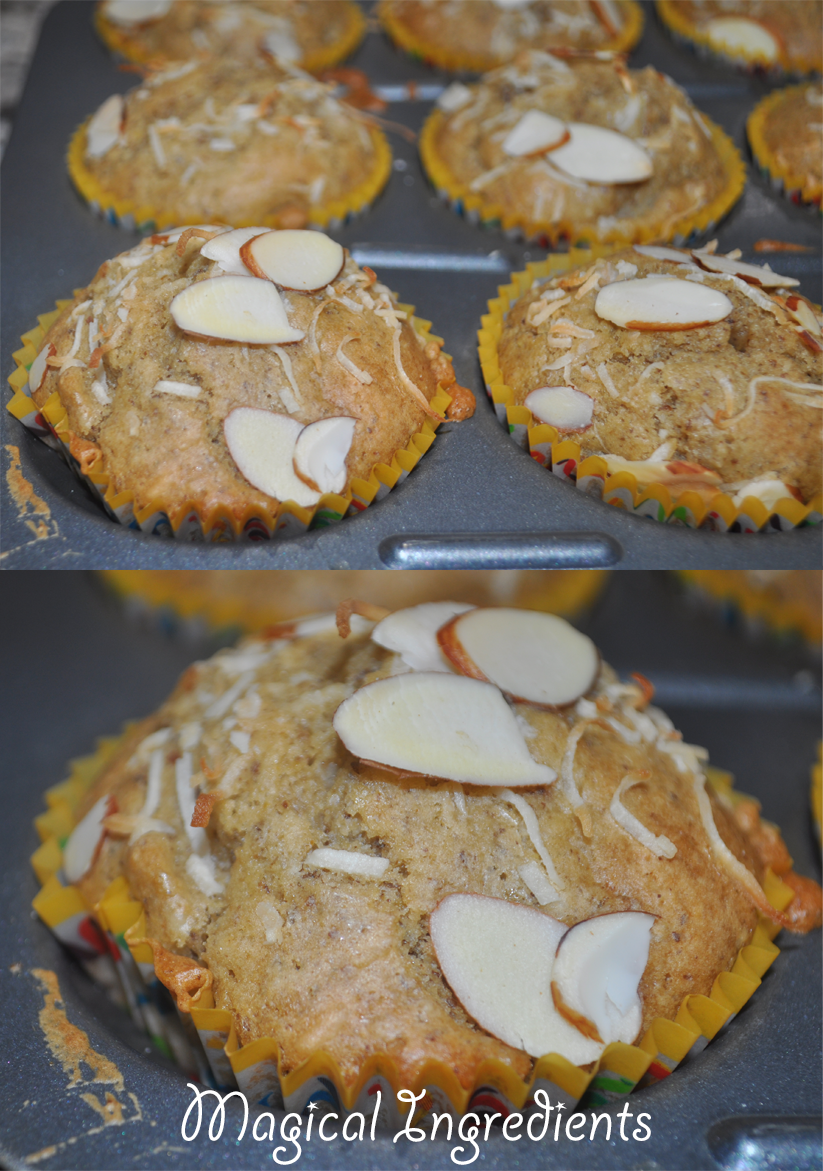 Fill into prepared muffin cavities to 3/4th level. Top with coconut flakes and sliced almonds. Bake for 20-21 minutes.