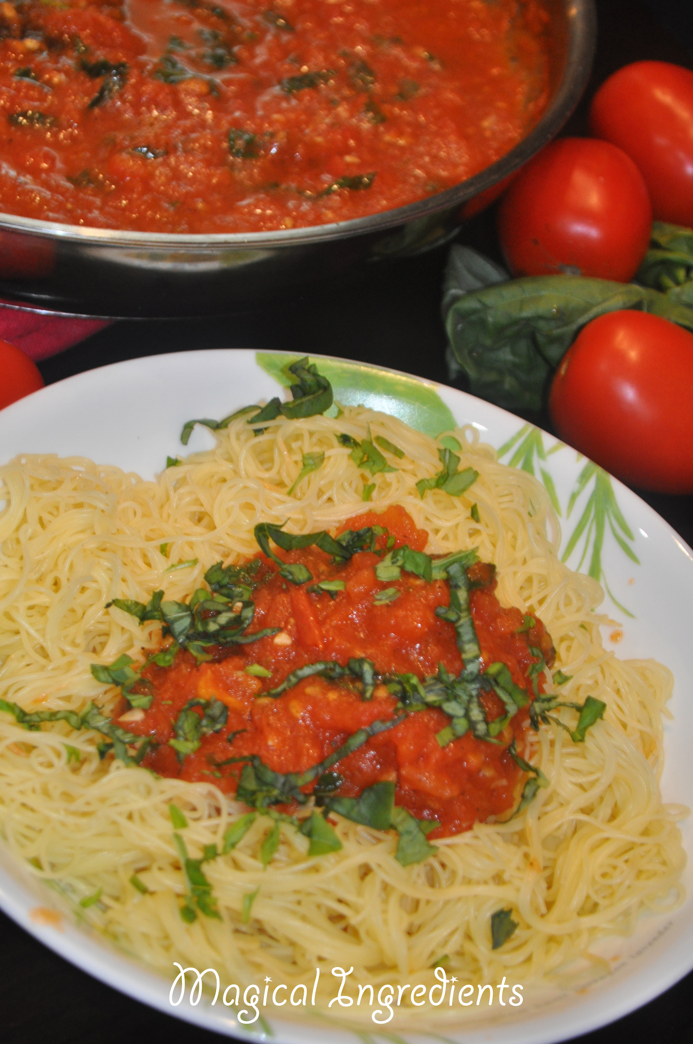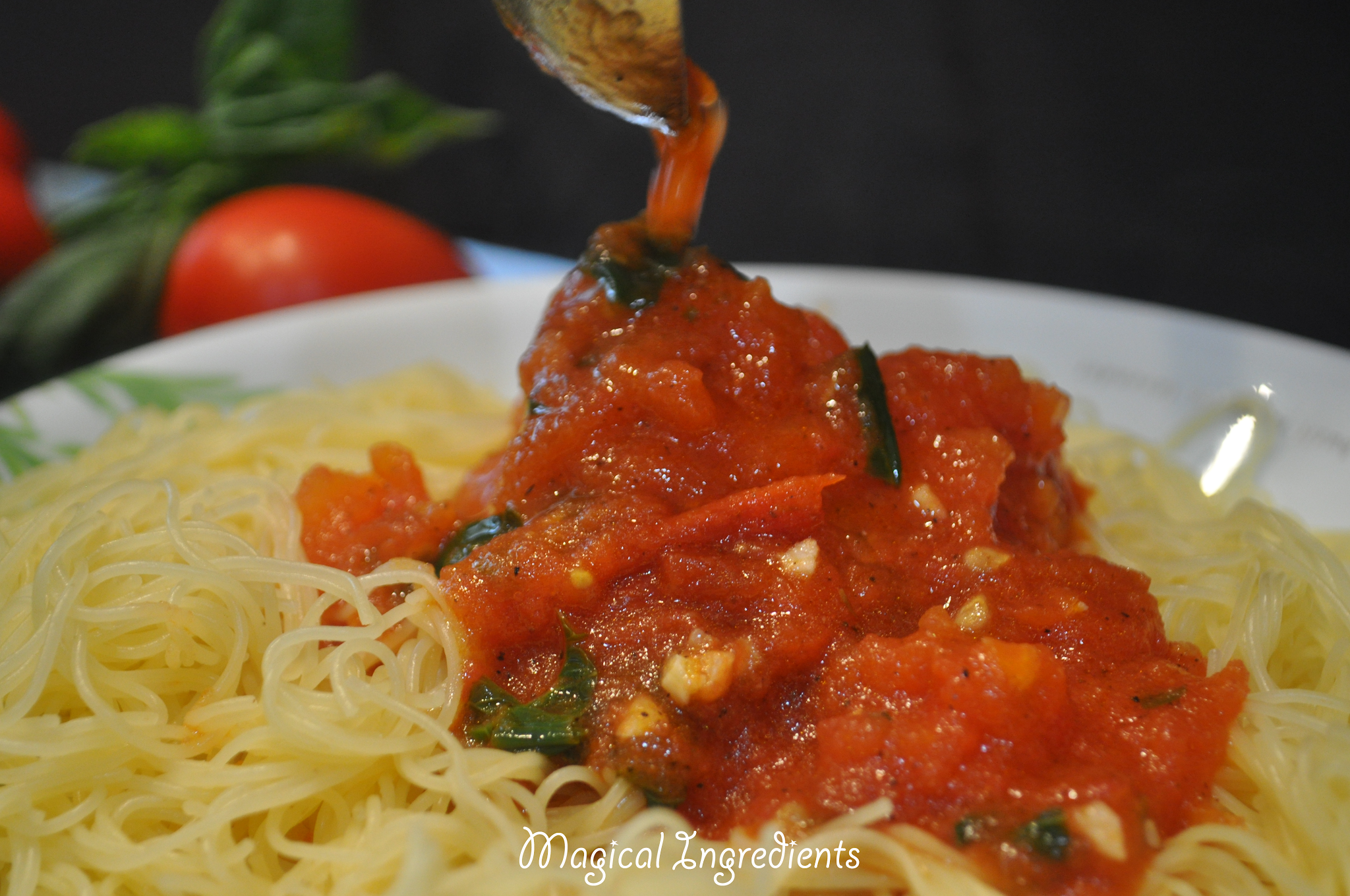 Blanch the tomatoes, peel, and chop them to make sauce. The juicy tomatoes add tons of flavors. The fresh basil add another dimension of flavor. Always, use best olive oil for this recipe. With these three points noted down, any one can make best angel hair pomodoro.