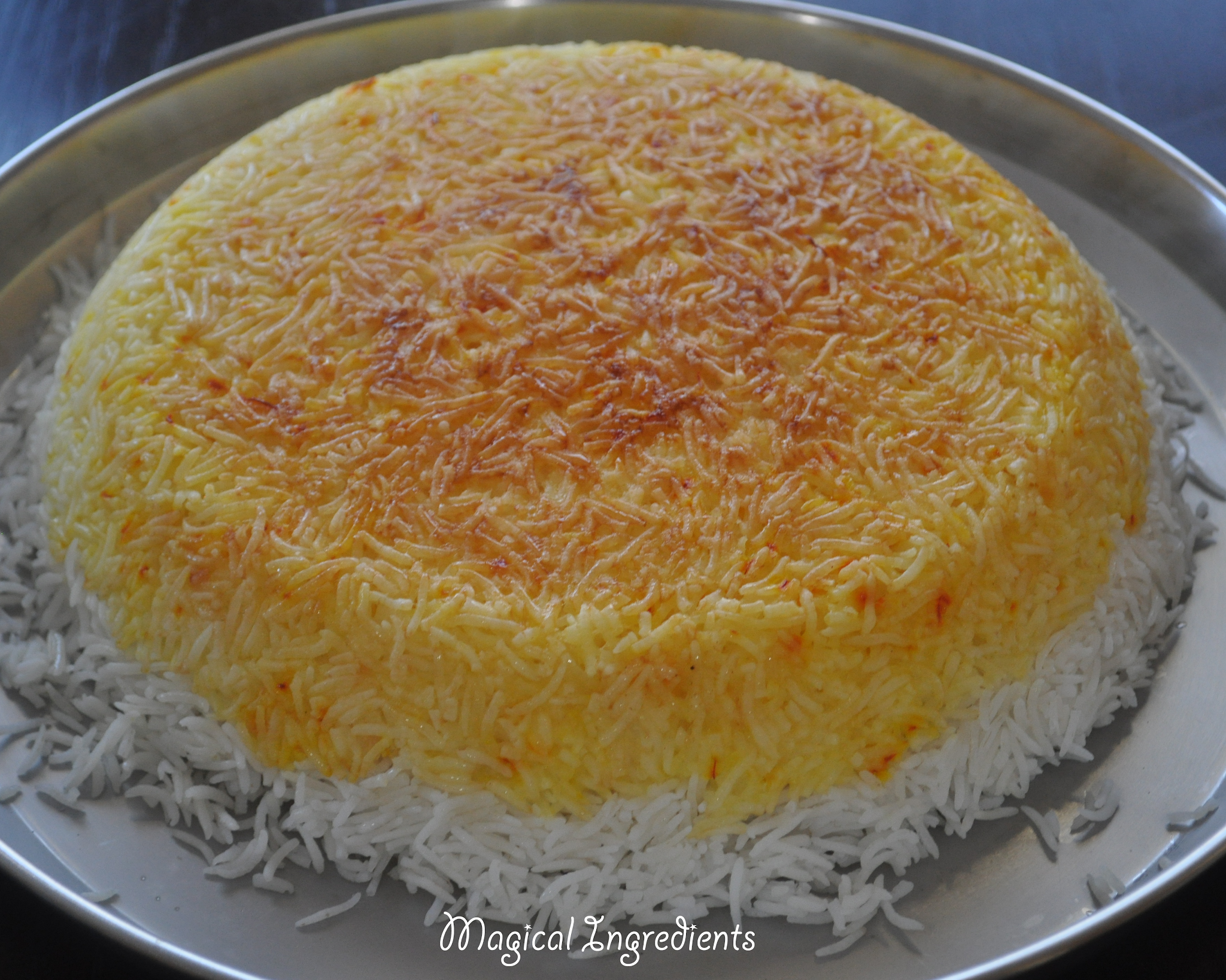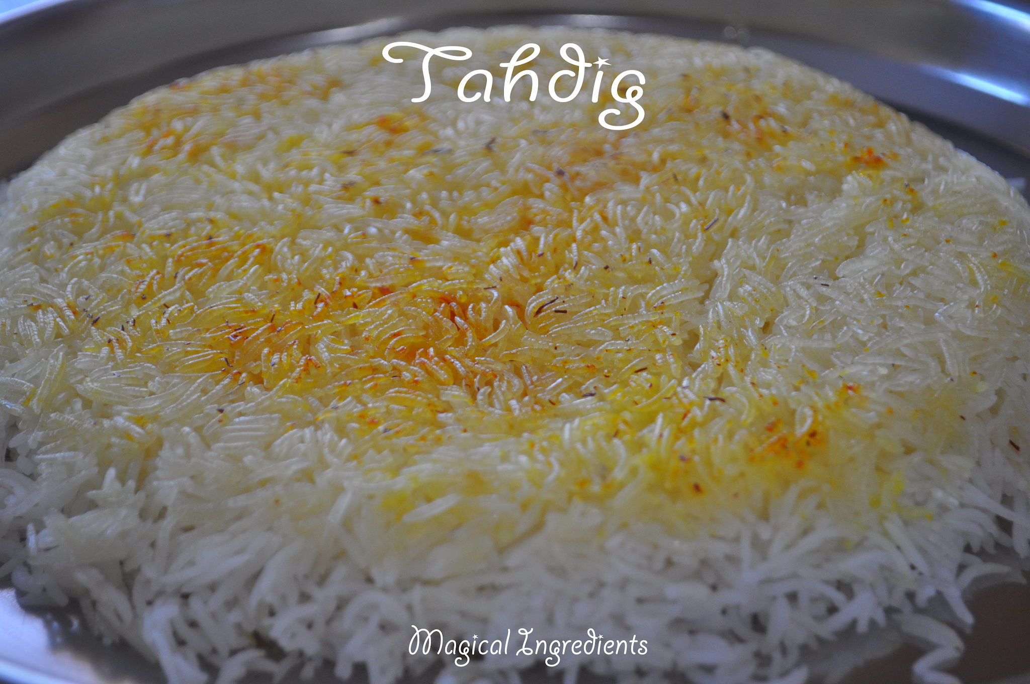 Tahdig is the Persian rice with the crispy crust at the bottom. The steamed rice is flavored with saffron and butter, and can be made in a couple of different ways.
