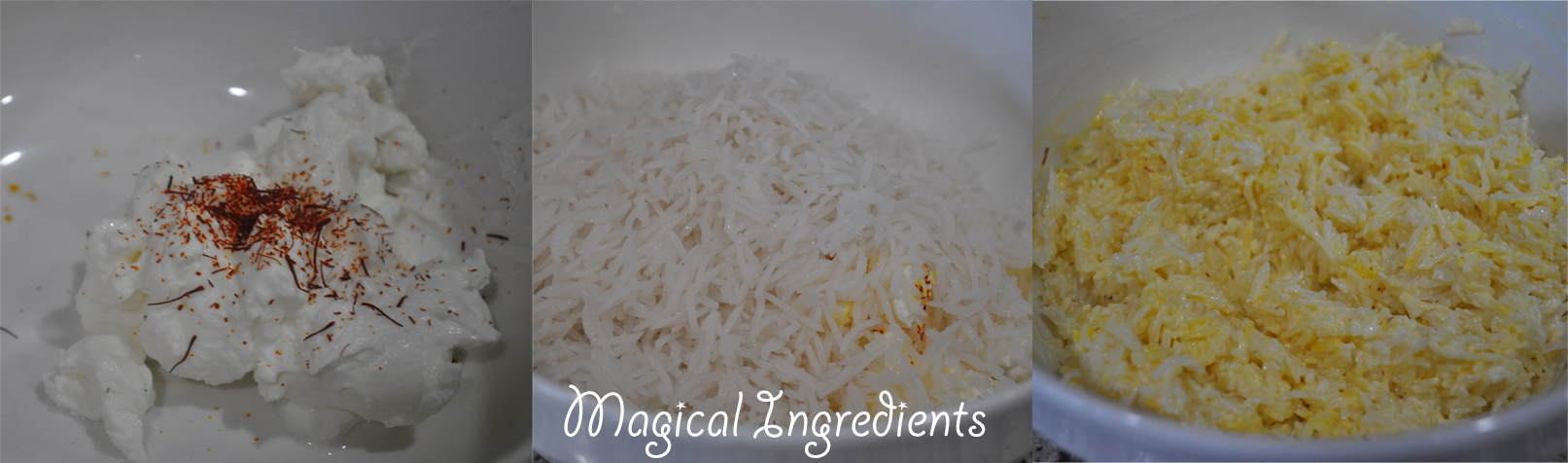 Take 1.5 cups of rice, mix with yogurt and saffron. Keep aside.