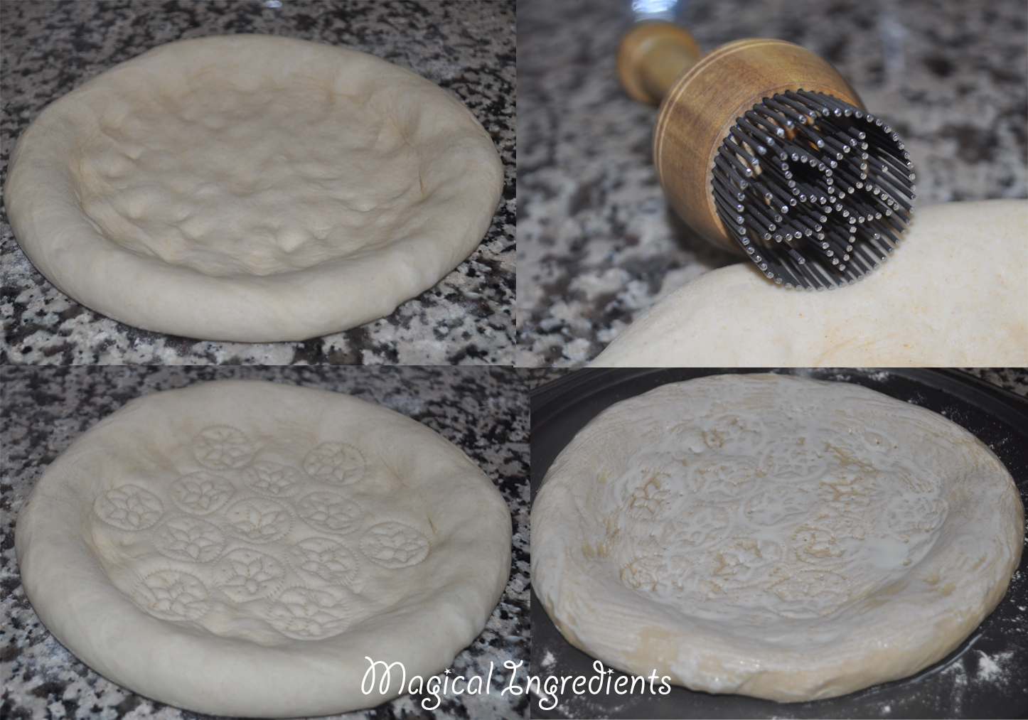 Gently flatten the dough a bit. Then gently push in the middle and slowly work towards the edges pushing the dough to the edge thereby creating a flat surface in the middle and creating a border around the edge to a circle of 20-22 inches diameter. Transfer to a baking stone or pizza pan. Punch using the stamps in the middle. Brush with heavy cream and sprinkle sesame seeds. Add water to the tray in the bottom to create steam. Put the non in the oven to bake. Bake for 22-23 minutes.