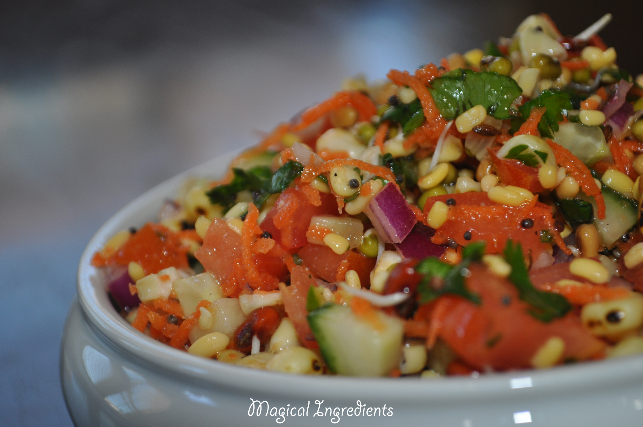 Dal sprouts salad is addictive and very healthy. Sprouts are a great form of nutrition and easy enough to digest at the same time. Including them as salads , curries, parathas, or fritters in the diet helps maintain weight and stay healthy. They provide excellent nourishment to kids too.