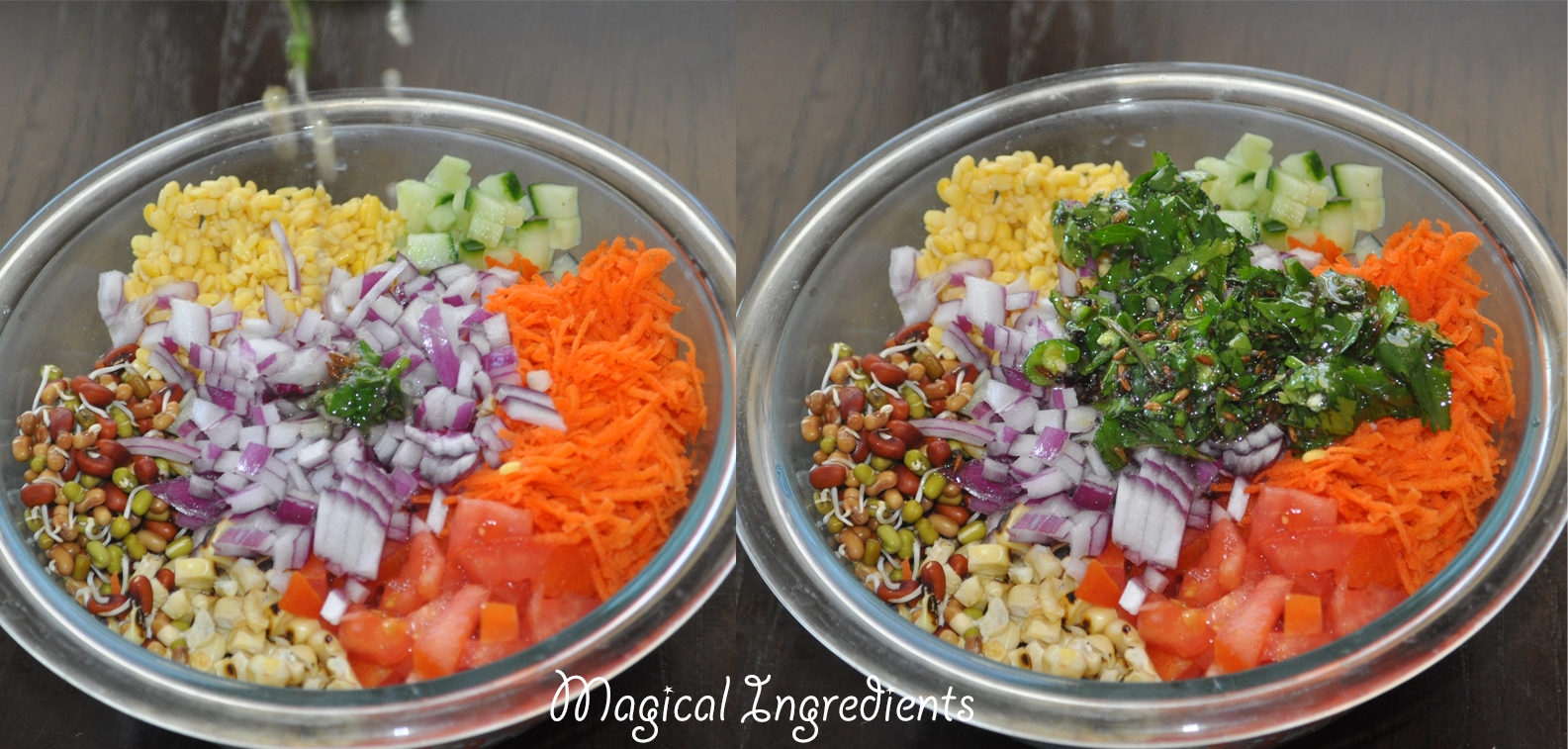Soak the yellow moong dhal in water for 1 hour. Drain the water. Add all the dal, sprouts, and veggies for the salad in a bowl.