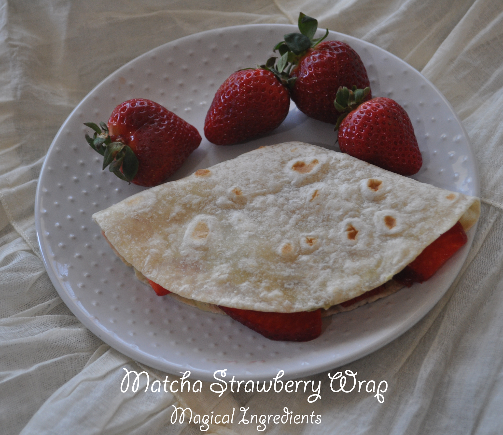 Mix a little matcha and honey according to taste to a tbsp of cream cheese. Spread it on a tortilla. Slice the strawberries and keep in the middle portion so that tri-fold can be made. Make the fold and serve.