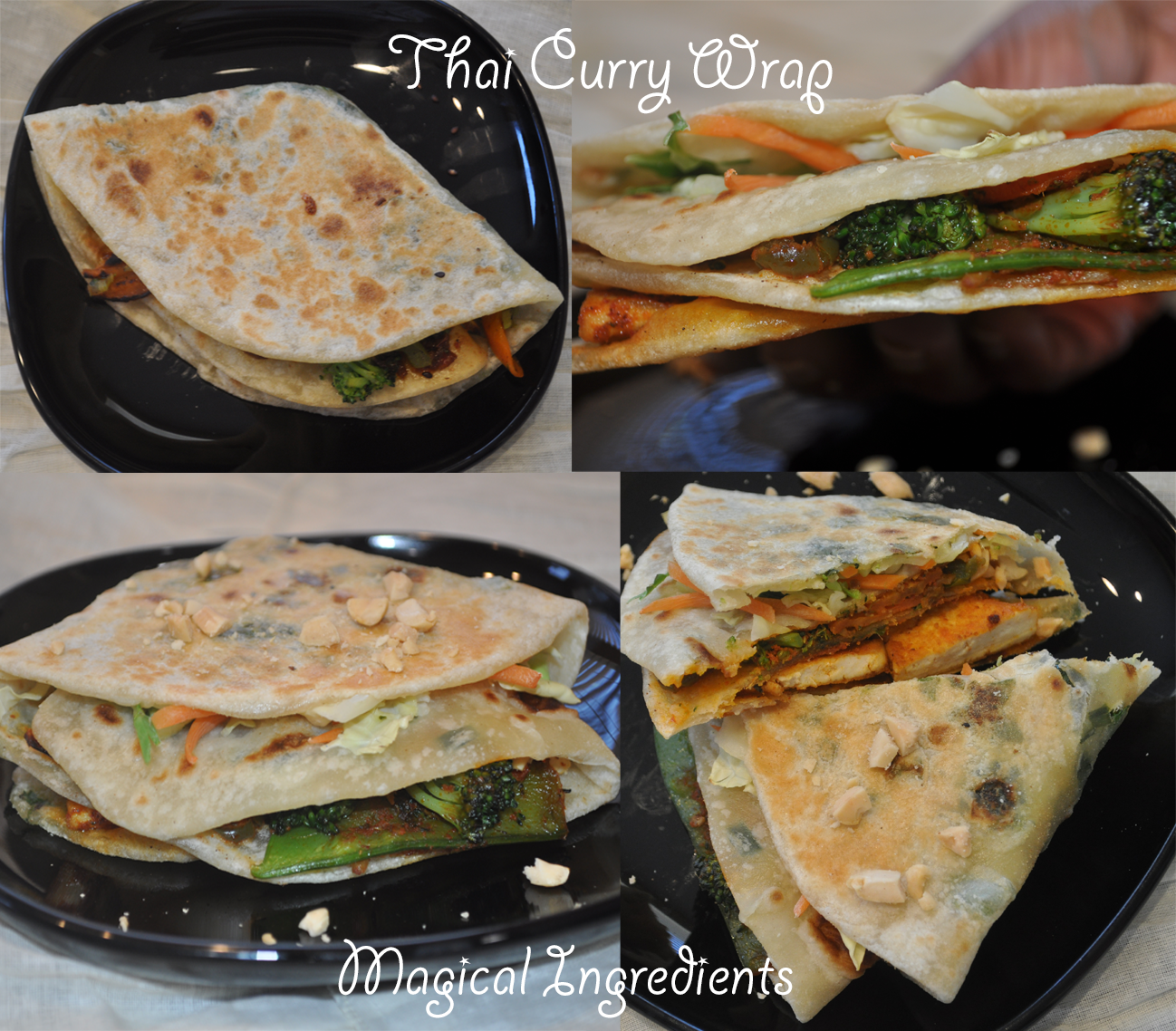 Sti fry tofu with Thai curry paste. Stir-fry veggie mix with salt, pepper, and Thai curry paste. Make a cut in the scallion pancake for 1/4th portion. Spread the veggies, coleslaw, tofu, and peanuts in four quarters and make a quarter fold. Toast and enjoy.