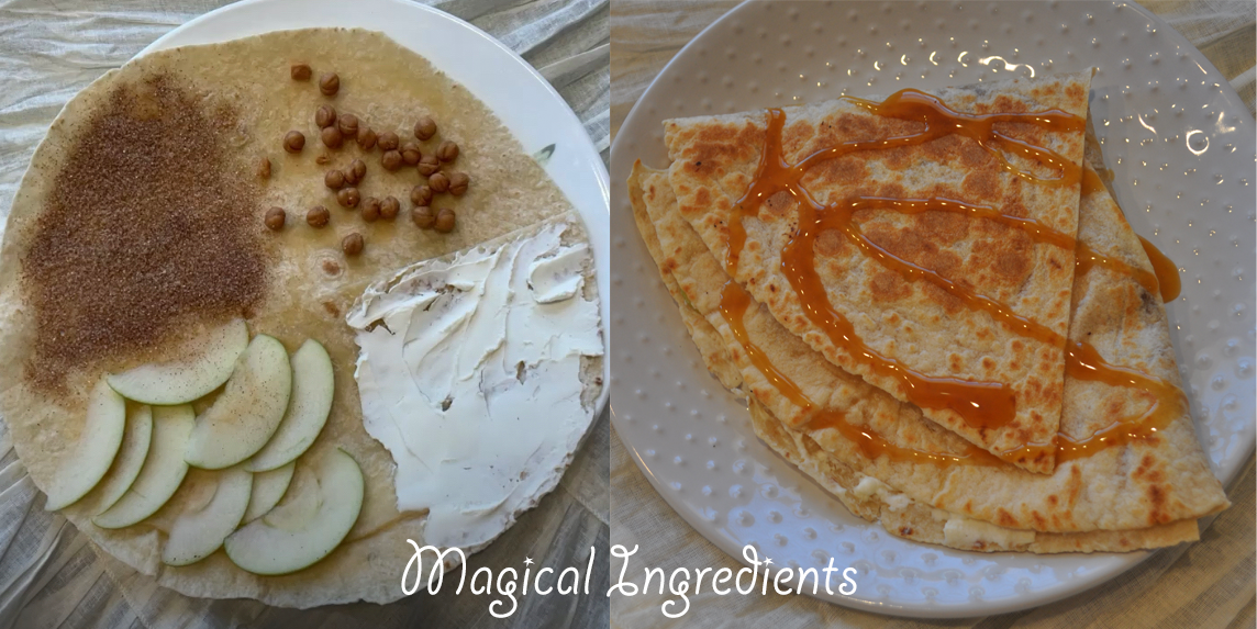 Make a cut from the center to the edge of the tortilla. In each quadrant of the tortilla, spread cream cheese, sliced apples, cinnamon-sugar, and caramel bits. Toast for the caramel to melt.