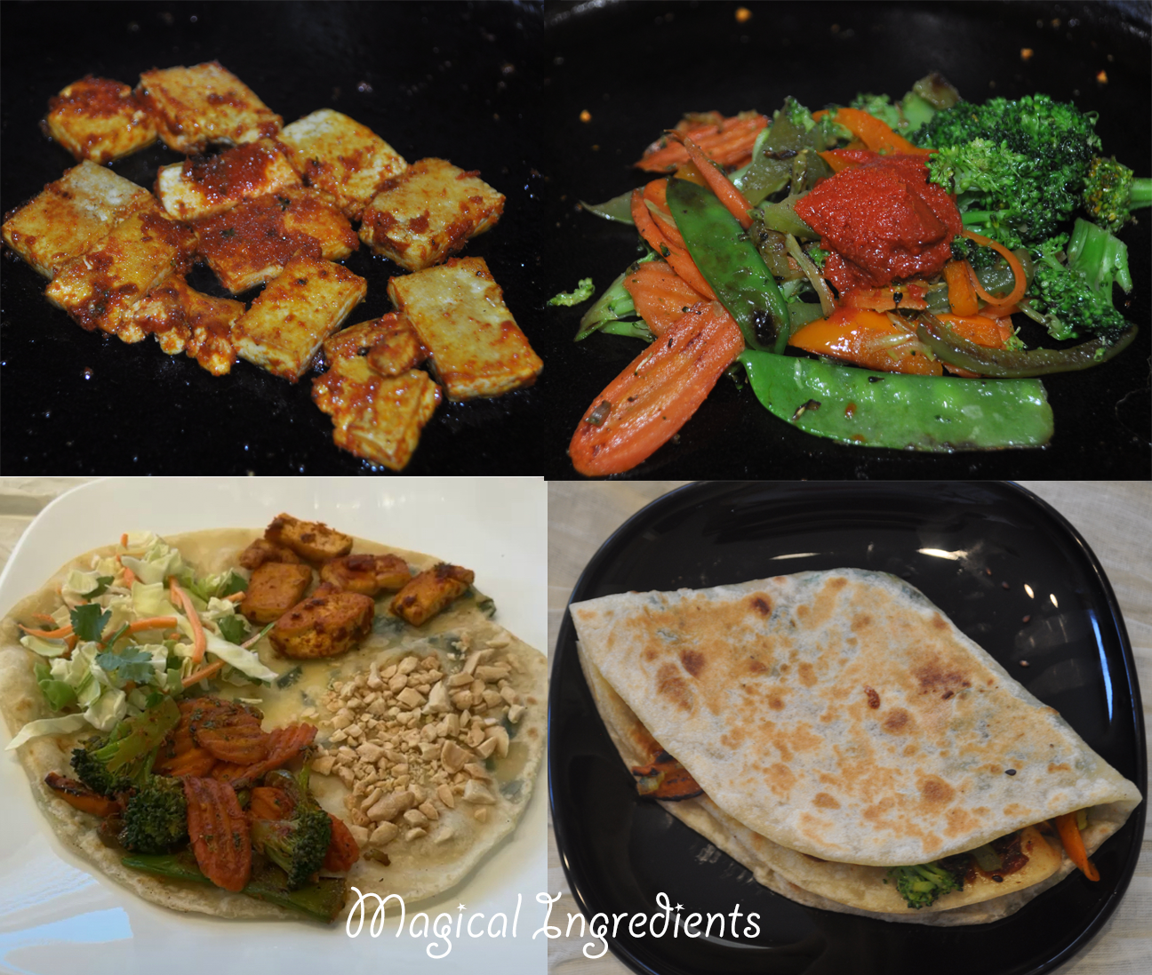 Saute the veggies with salt and schezwan sauce. Saute the tofu cubes with salt and pepper. Make a cut in the scallion pancake. Spread schezwan sauce, stir-fried veggies, coleslaw, and tofu. Make a quarter fold and toast.