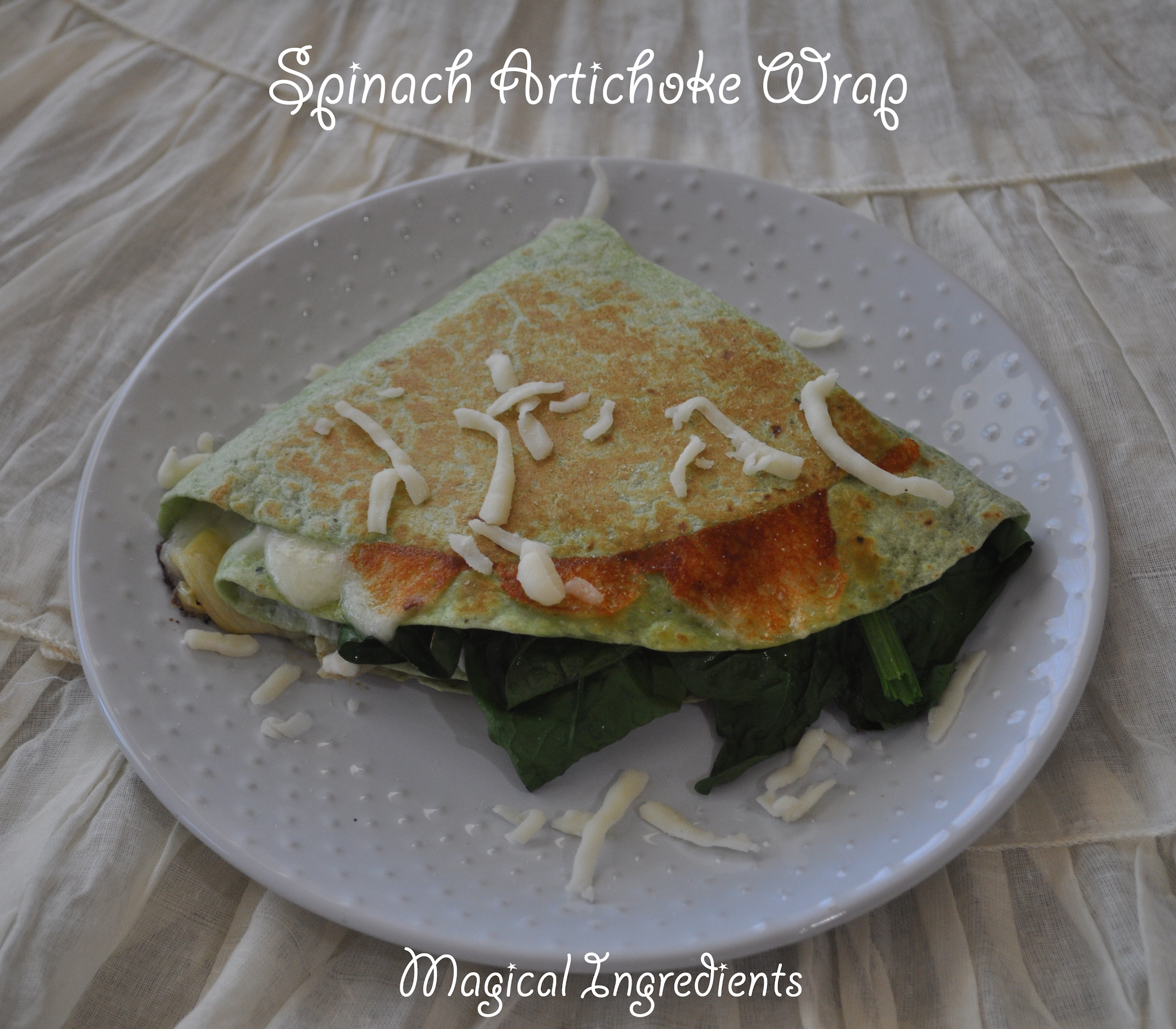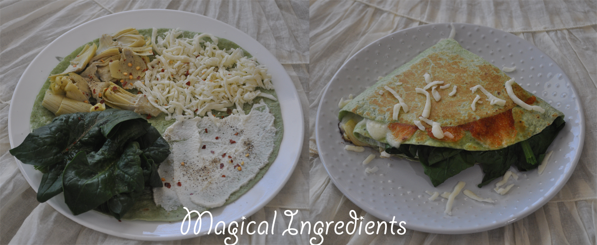 Cut the spinach tortilla from the center to the edge. Spread ricotta, spinach, shopped artichokes, and mozzarella on each quarter of the tortilla. Make a quarter fold and toast till cheese melts.