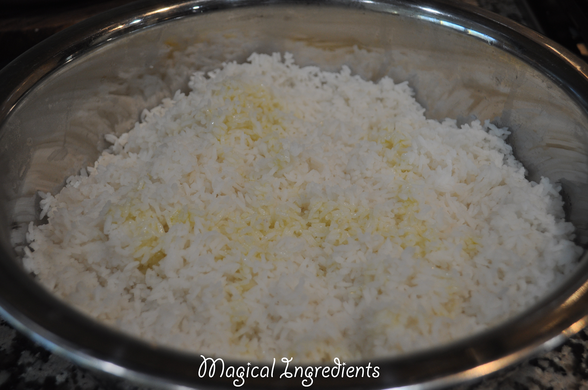 Transfer the rice to a big bowl, to aid quick cooling. One or two teaspoon of oil can be added to prevent it from sticking. Sprinkle the salt and set aside.