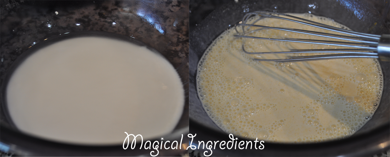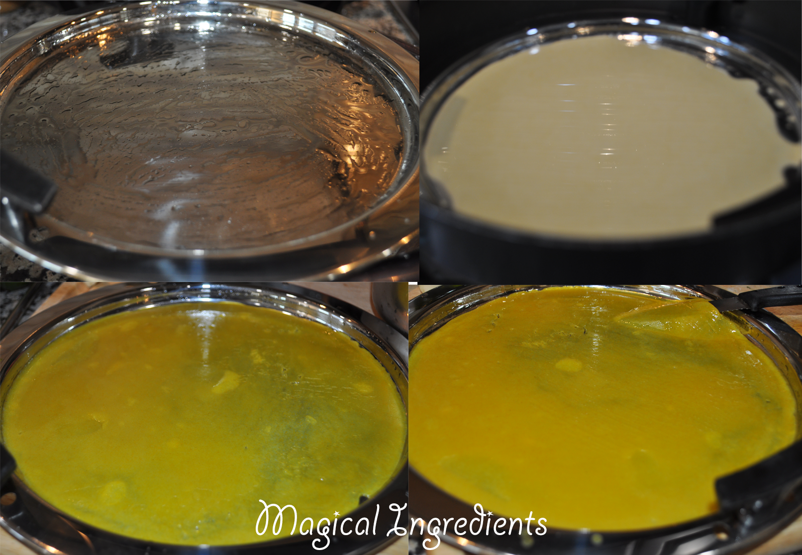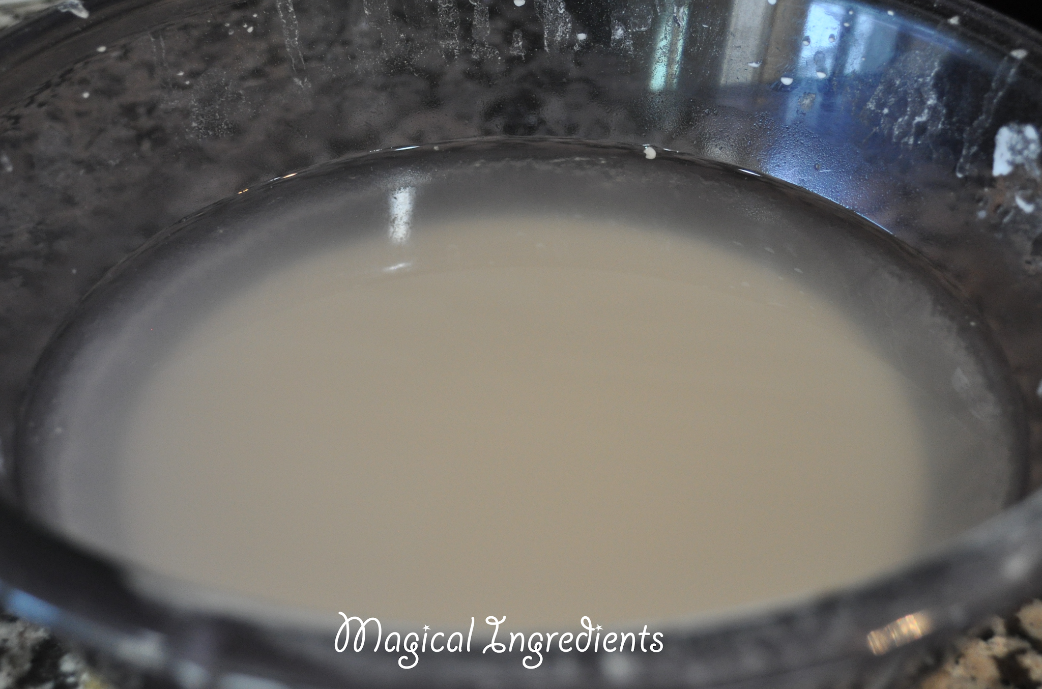 With a whisk, slowly mix the starch which would have settled firmly at the bottm. It should be a thin batter. Mix turmeric or yellow food color.