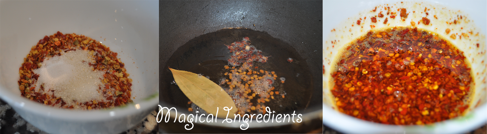 Grind about 10-15 dried red chilies to a coarse mix. Add salt and sugar. Heat 3 tbsp oil and add fenugreek, bay leaf, and peppercorns. Fry for 1-2 minutes. Filter and add to the chili mix. Cover and set aside till the sizzling settles.