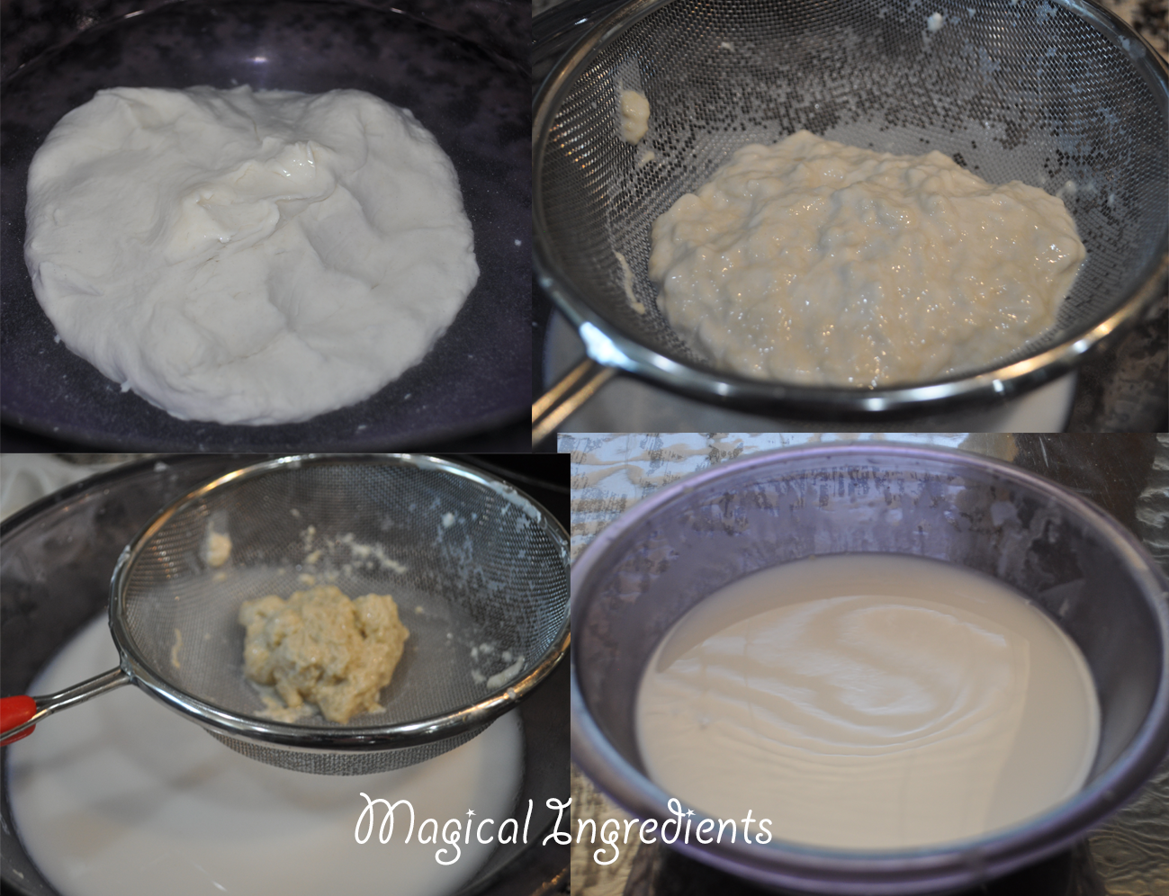 Add a cup of water and squeeze to get the milky liquid which is the starch from the flour getting in solution. Filter and to the gluten add a cup of water and repeat the same process twice to extract maximum starch. Squeeze the gluten and set aside. Cover the starchy liquid and set aside undisturbed for 6-7 hours or overnight.